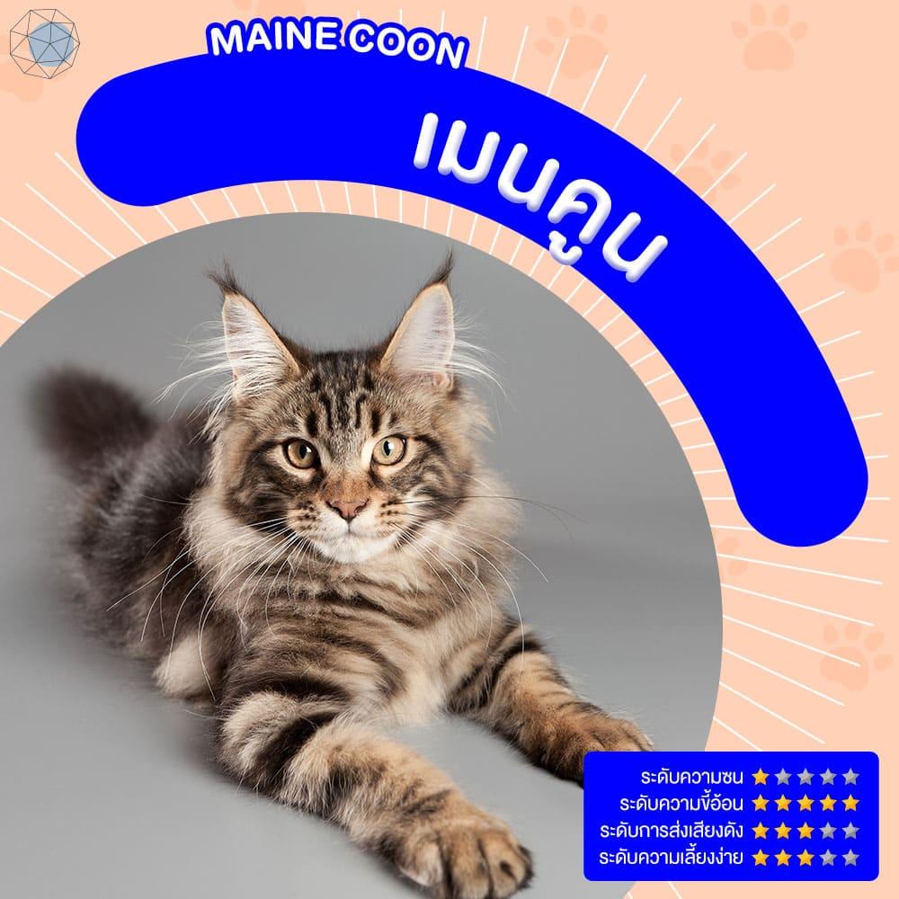เมนคูน เป็นแมวพันธุ์ใหญ่ที่สุดในโลก ขนยาวฟู หางเป็นพวง ใบหูมีพู่ปลายหู
