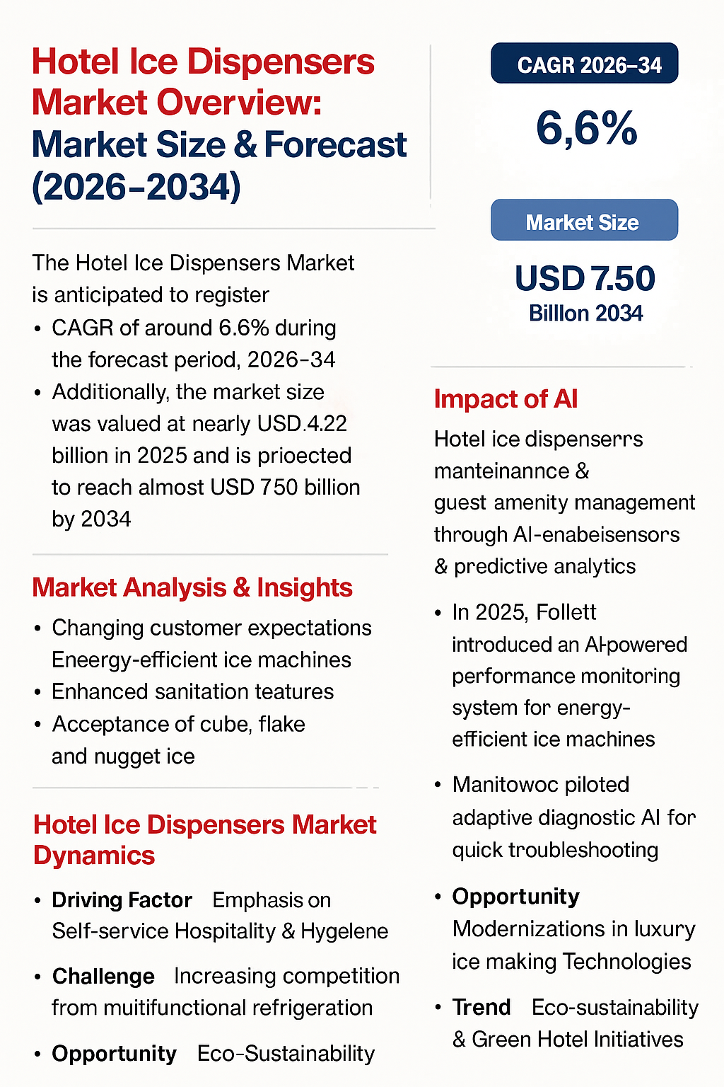 According to the latest report by The Report Cube, study Hotel Ice Dispensers Market is anticipated to register a CAGR of around 6.6% during the forecast period, 2026-34. Additionally, the market size was valued at nearly USD 4.22 billion in 2025 and is projected to reach almost USD 7.50 billion by 2034.