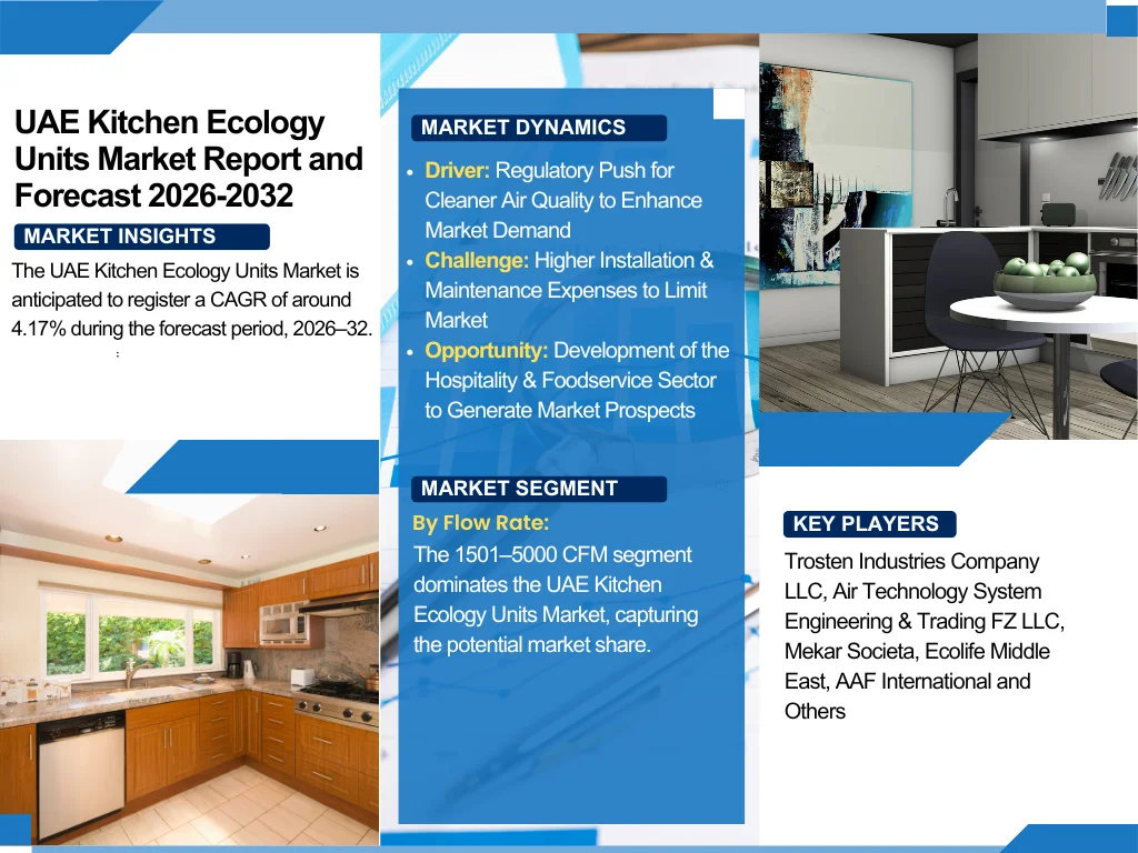 The UAE Kitchen Ecology Units Market is anticipated to register a CAGR of around 4.17% during the forecast period, 2026–32. The primary factors prompting the market outlook include surging urbanization, the expansion of the hospitality sector, and more stringent environmental laws. To preserve air quality & comply with health & safety guidelines, restaurants, hotels, and large commercial kitchens are increasingly employing advanced ecology units to decrease smoke, odor, and grease emissions.