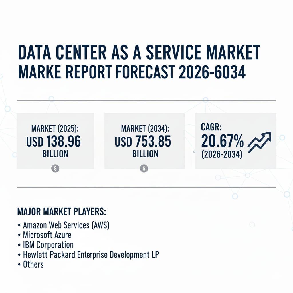 The Data Center as a Service Market is experiencing transformative expansion, driven by digital transformation imperatives, cloud migration acceleration, and capital expenditure optimization strategies. Valued at USD 138.96 billion in 2025, the market is projected to reach USD 753.85 billion by 2034, reflecting an exceptional 20.67% CAGR. Data Center as a Service (DCaaS) encompasses comprehensive cloud-based infrastructure solutions delivering compute, storage, networking, and management capabilities through subscription models, eliminating traditional capital-intensive data center ownership while providing scalable, on-demand resources accessible via internet connectivity.