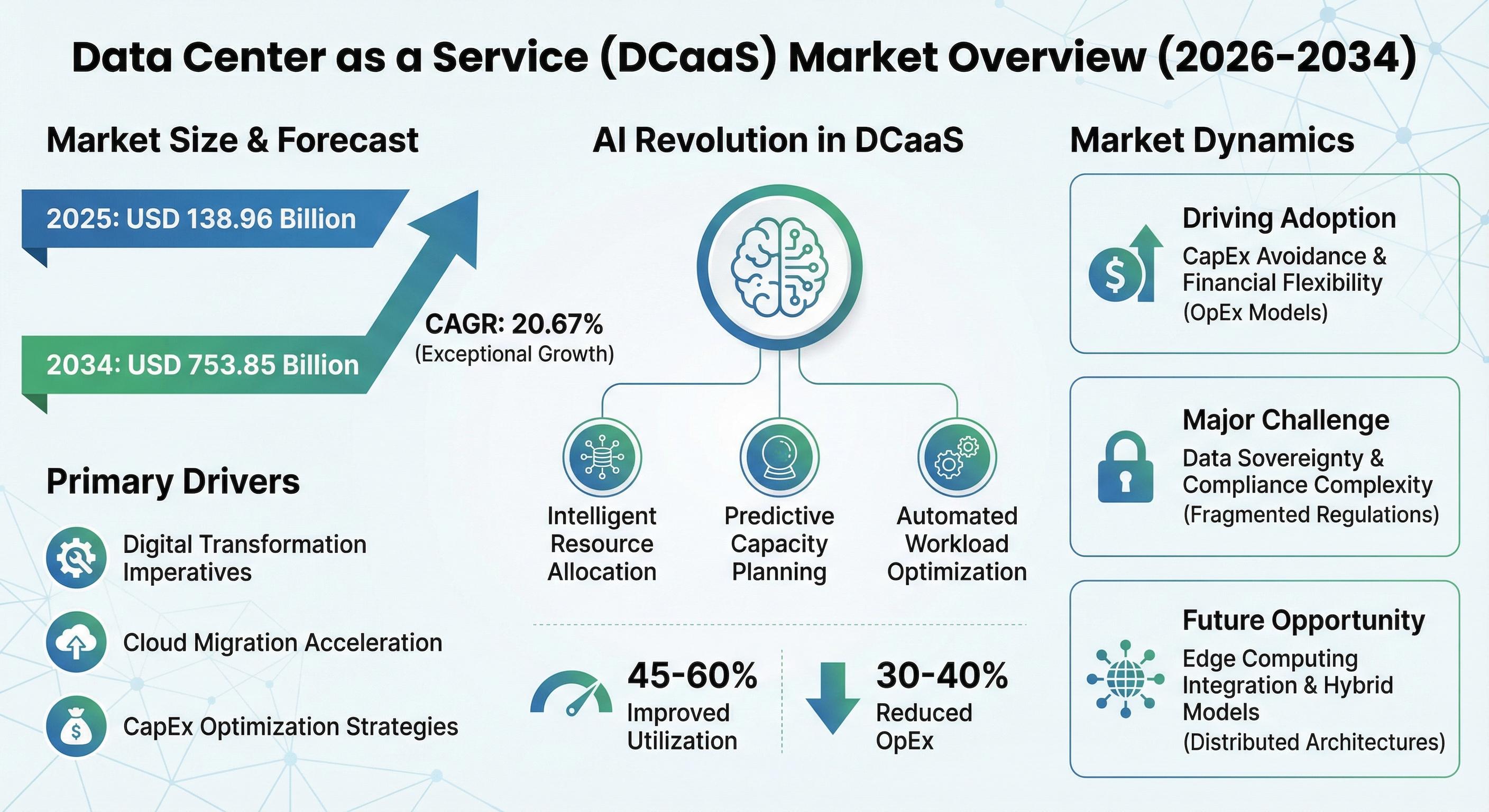 Organizations face mounting pressure to reduce capital-intensive infrastructure investments as traditional data center deployments require USD 10-25 million upfront costs for facilities, power infrastructure, cooling systems, and IT equipment with 3-5 year depreciation cycles. Data Center as a Service models convert these capital expenditures into predictable operational expenses, preserving working capital for core business initiatives while eliminating technology obsolescence risk.