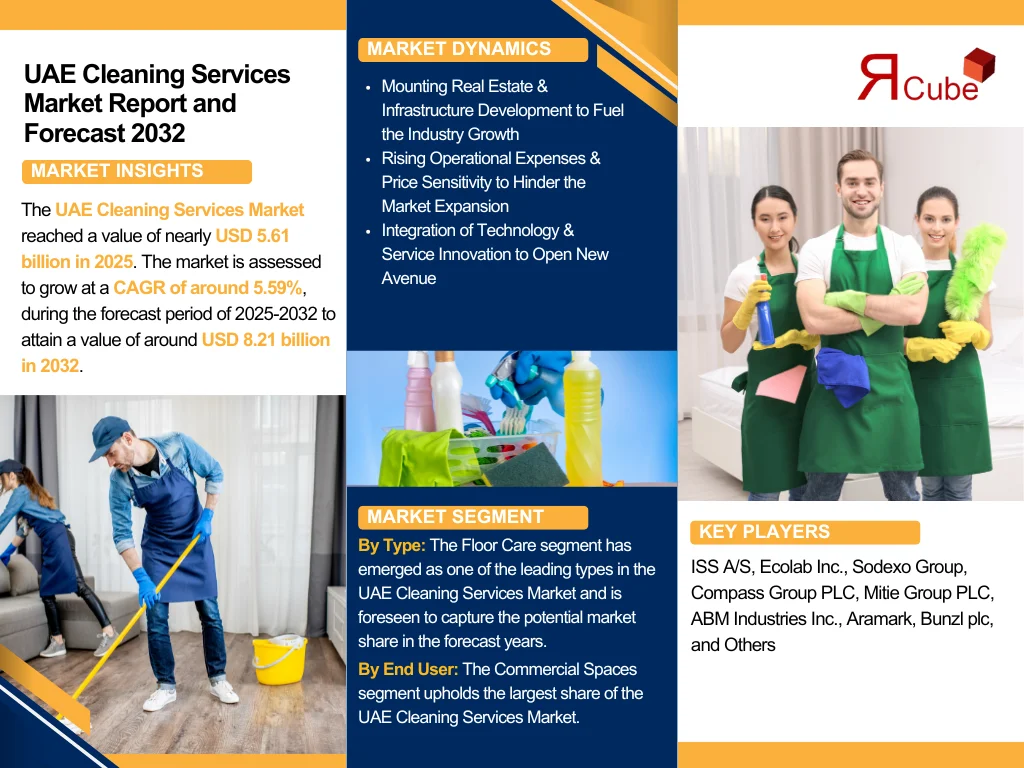 The UAE Cleaning Services Market reached a value of nearly USD 5.61 billion in 2025. The market is assessed to grow at a CAGR of around 5.59%, during the forecast period of 2025-2032 to attain a value of around USD 8.21 billion in 2032. This strong development trajectory is majorly compelled by the UAE's flourishing construction sector, growing commercial infrastructure, and amplified hygiene awareness.