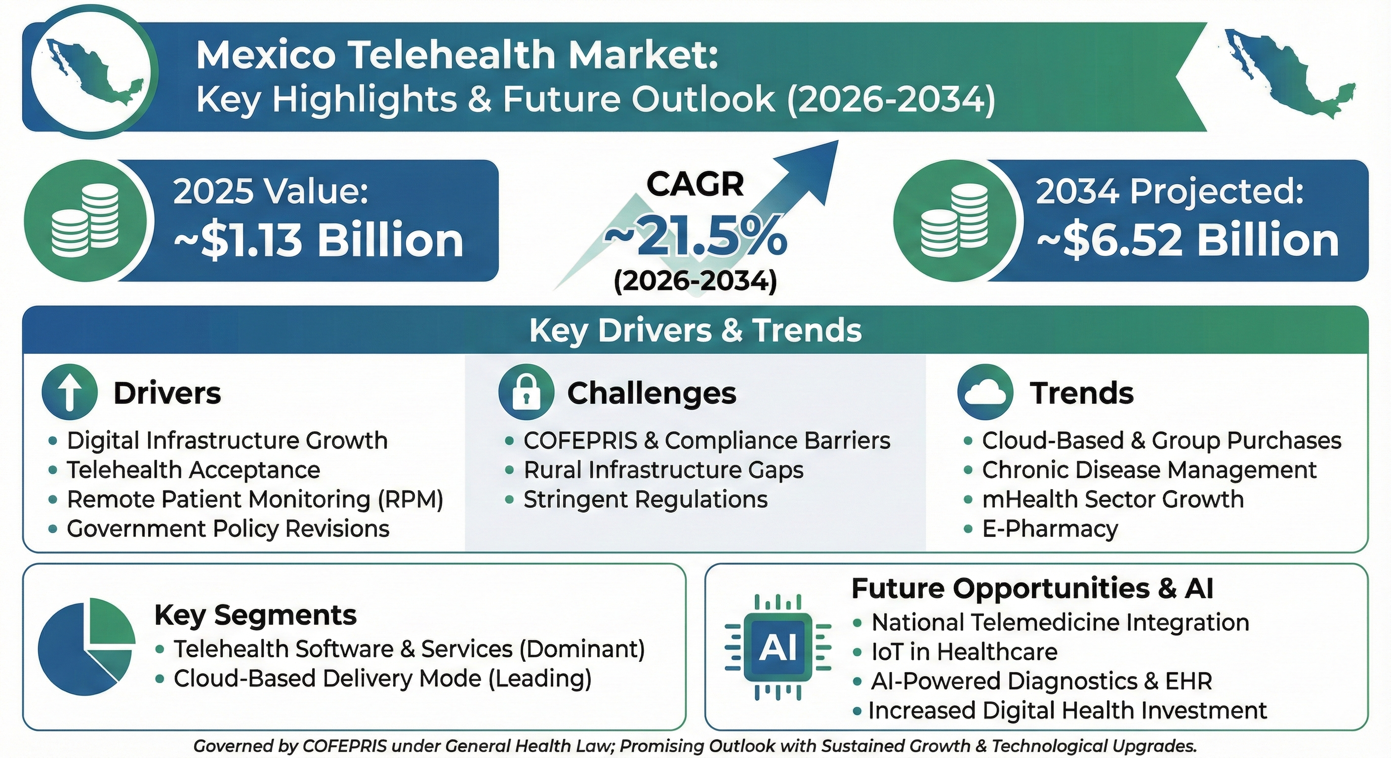 · The Mexico Telehealth Market is projected to register a CAGR of about 21.5% during 2026–34.