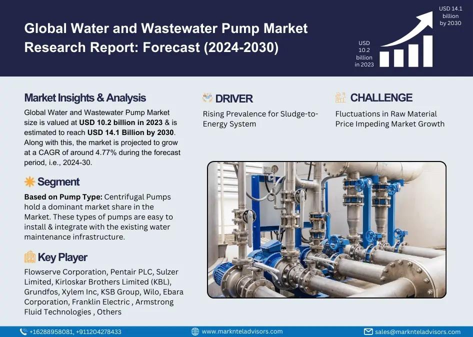 As per recent study by Markntel Advisors The Global Water & Wastewater Pumps Market size is valued at USD 10.2 billion in 2023 & is estimated to reach USD 14.1 billion by 2030. Along with this, the market is projected to grow at a CAGR of around 4.77% during the forecast period, i.e., 2024-30.
