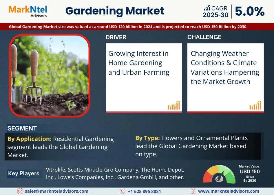 As per recent study by Markntel Advisors The Global Gardening Market size was valued at around USD 120 billion in 2024 and is projected to reach USD 150 Billion by 2030. Along with this, the market is estimated to grow at a CAGR of around 5% during the forecast period, i.e. 2025-30.