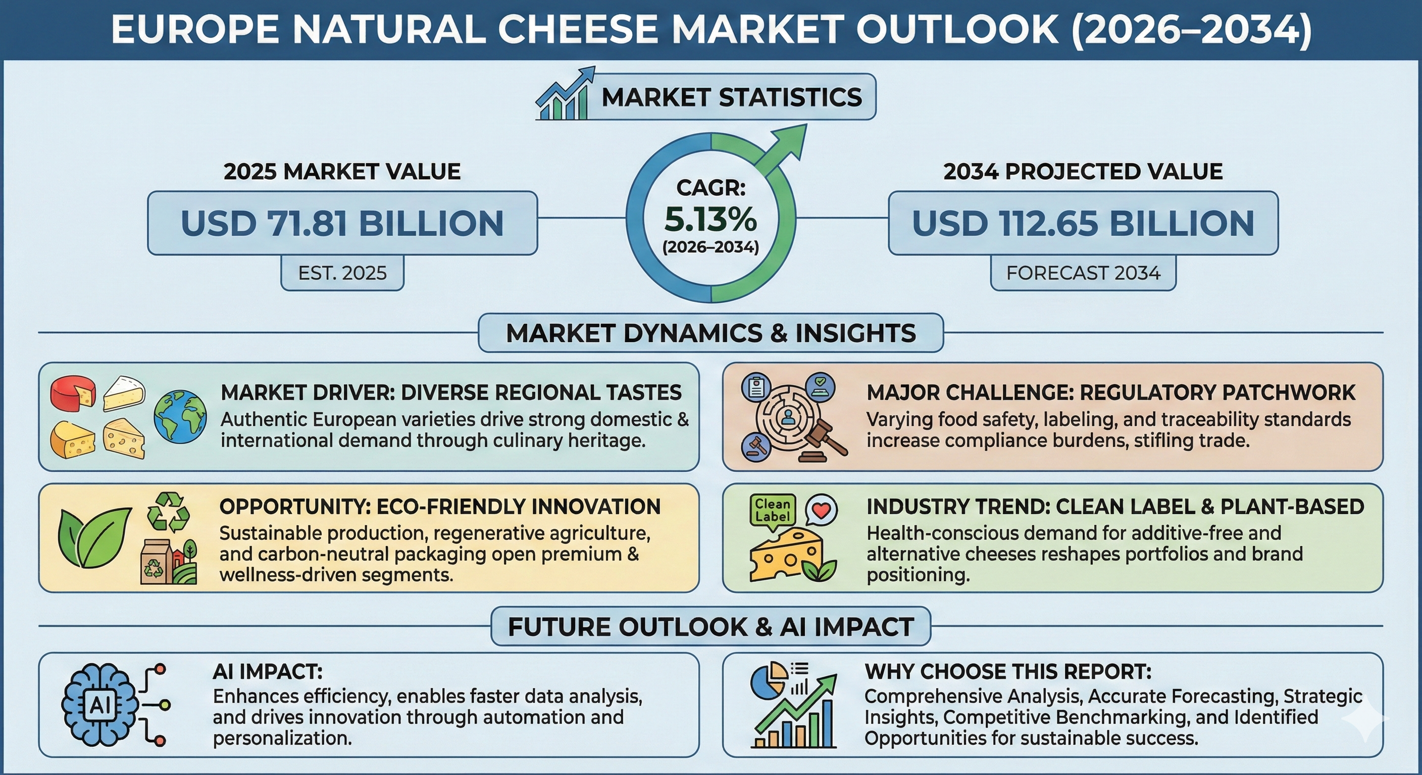 The Report Cube, a leading provider of industry-focused research insights, has released a comprehensive report titled Europe Natural Cheese Market Report and Forecast 2034 analyzing the latest trends and forecast data for the market. The study covers market size, growth rate, segment analysis, regional breakdowns, and competitive intelligence.