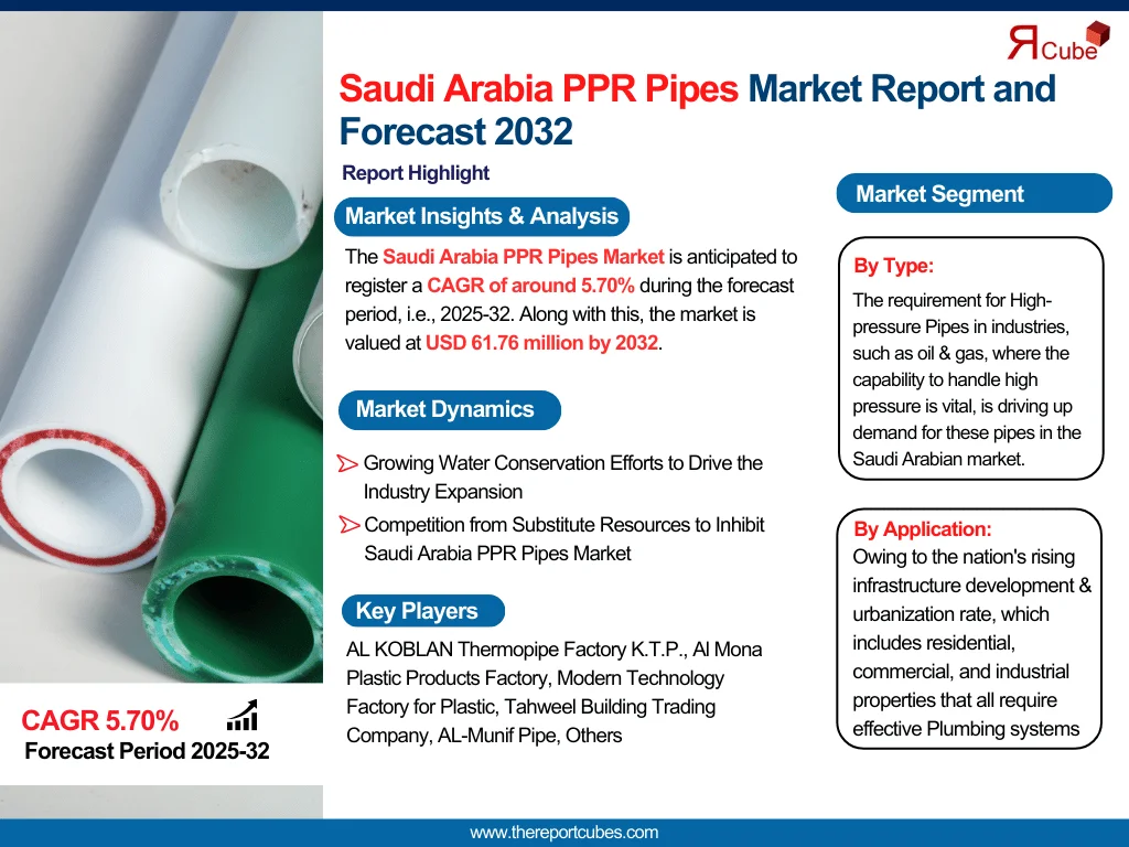 The Report Cube, a leading provider of industry-focused research insights, has released a comprehensive report titled Saudi Arabia PPR Pipes Market Report and Forecast 2032 analyzing the latest trends and forecast data for the market. The study covers market size, growth rate, segment analysis, regional breakdowns, and competitive intelligence.