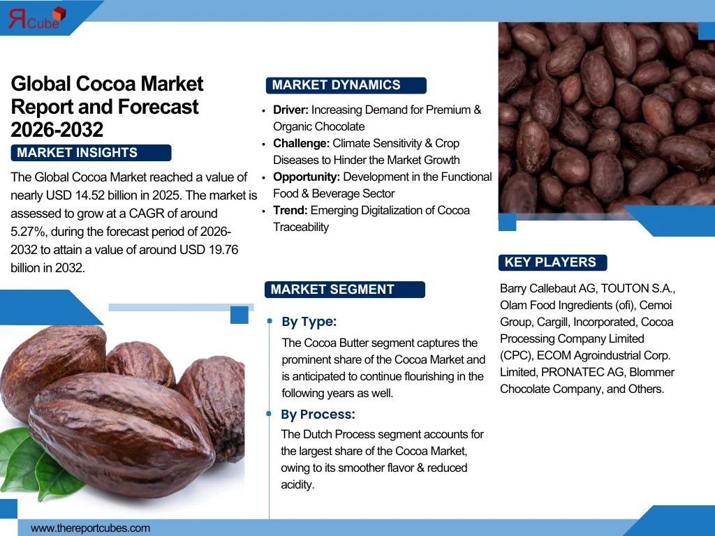 According to the latest report by The Report Cube, study Cocoa Market is assessed to grow at a CAGR of around 5.27%, during the forecast period of 2026-2032 to attain a value of around USD 19.76 billion in 2032. The primary aspects driving the Cocoa Market growth is the upsurge in the usage of dark chocolate, which is considered to be a better alternative. Also, demand is being encouraged by consumers' increasing desire for fair-trade & organic cocoa, specifically in North America & Europe. Also, the leading companies are being influenced to embrace ethical sourcing practices by initiatives that support sustainable cocoa production, like the Cocoa & Forests Initiative (CFI), which is gaining traction.