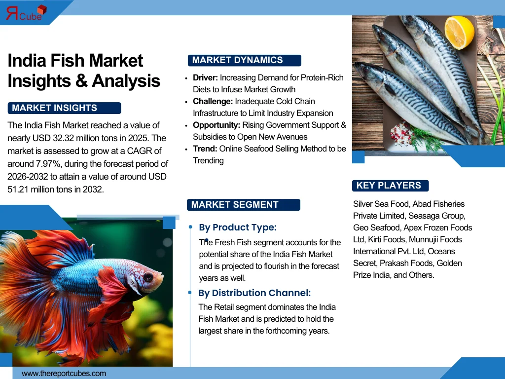 According to the latest report by The Report Cube, study India Fish Market is assessed to grow at a CAGR of around 7.97%, during the forecast period of 2026-2032 to attain a value of around 51.21 million tons in 2032. In line with India’s huge coastline, ample inland water resources, and resilient aquaculture sector. The India Fish Market is developing swiftly owing to augmented consumption, increasing consciousness of nutritional advantages, and robust government support under schemes such as the Pradhan Mantri Matsya Sampada Yojana (PMMSY). Also, the country is the second-largest producer of fish worldwide, with noteworthy contributions from both inland & marine sources.
