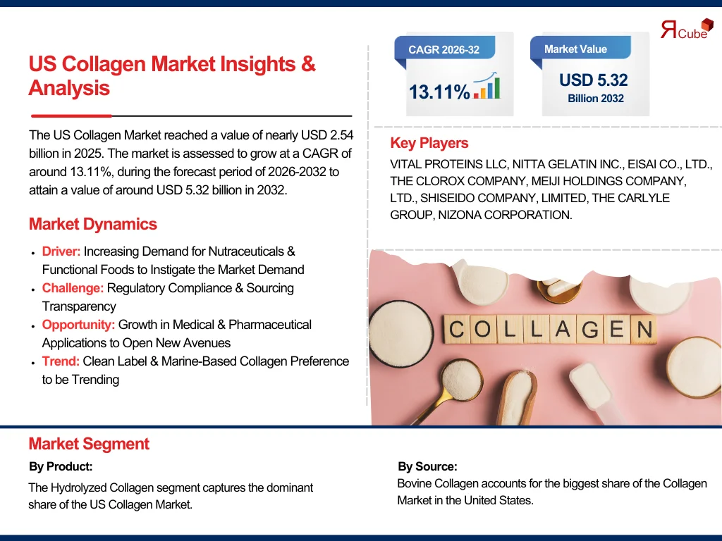 According to the latest report by The Report Cube, study US Collagen Market is assessed to grow at a CAGR of around 13.11%, during the forecast period of 2026-2032 to attain a value of around USD 5.32 billion in 2032. The industry is driven by rising customer awareness of collagen’s health benefits, increasing applications in nutraceuticals, cosmetics, and the medical industry, and the growing prevalence of protein-rich dietary supplements.