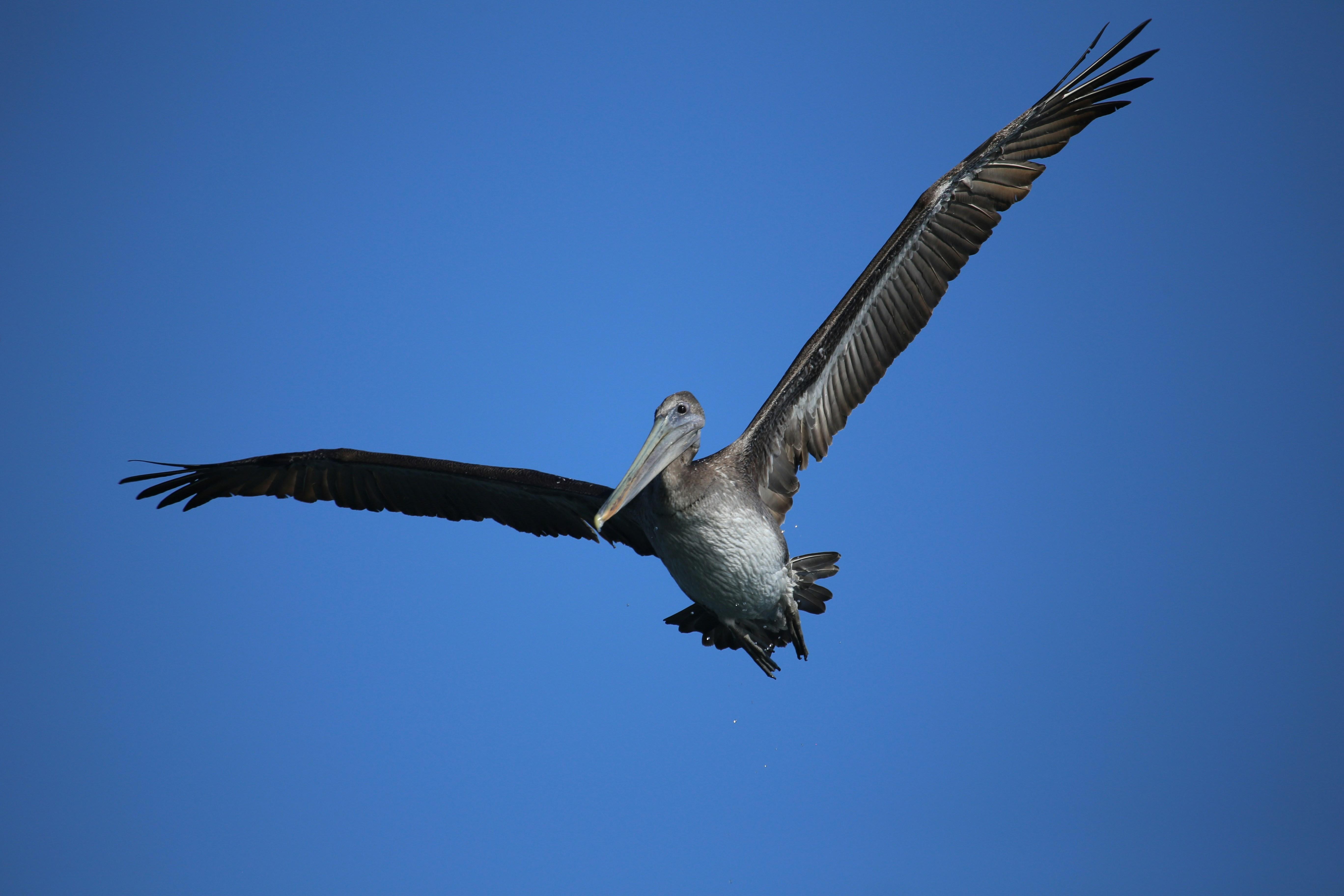 As the pelican glides overhead, wings stretched wide against the bright blue canvas of the sky, one might marvel at the elegance of this coastal sentinel. Yet, beneath this tranquil facade lies a complex world of sharp-eyed scrutiny and calculated movements, where the very air seems to ripple with intent. In a moment of almost cinematic grace, a droplet of ocean water bursts from its bill, leaving a glistening trace—a testament not just to nature's beauty but to the pelican's relentless pursuit of sustenance.