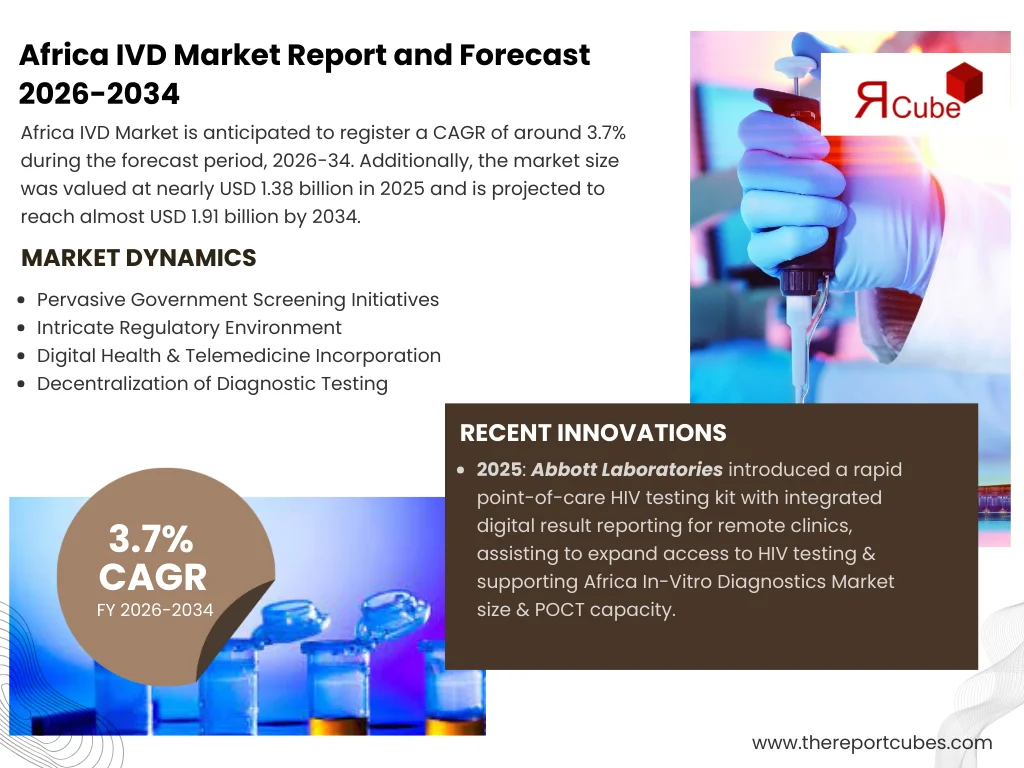 The Report Cube, a leading provider of industry-focused research insights, has released a comprehensive report titled Africa IVD Market Report and Forecast 2034 analyzing the latest trends and forecast data for the market. The study covers market size, growth rate, segment analysis, regional breakdowns, and competitive intelligence.