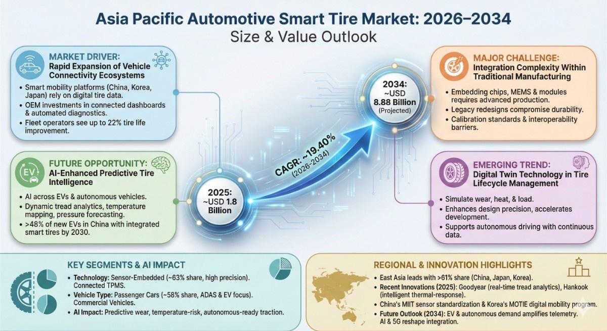 According to the latest report by The Report Cube, study Asia-Pacific Automotive Smart Tire Market is anticipated to register a 19.40% CAGR during 2026–2034. The market size was valued at USD 1.8 billion and is projected to reach USD 8.88 billion by 2034.