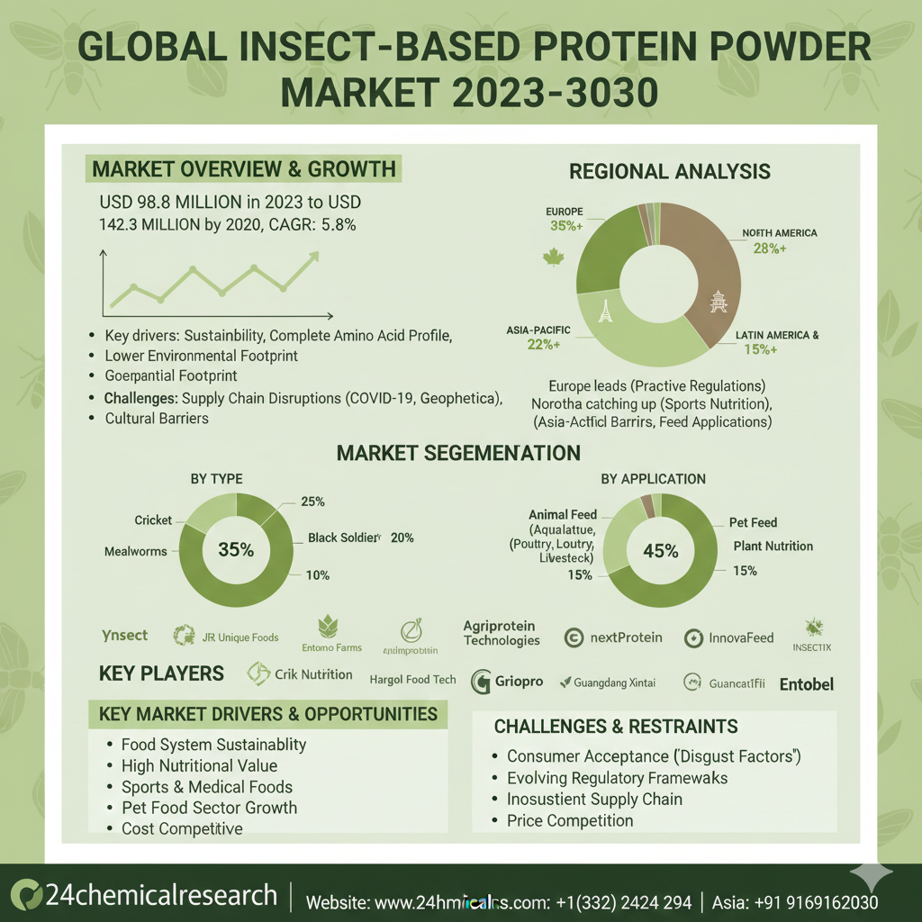 Global Insect-based Protein Powder Market has emerged as a key player in sustainable nutrition, currently valued at USD 98.8 million USD in 2023. Market analysts project steady expansion at a CAGR of 5.8%, pushing the market to reach USD 142.3 million USD by 2030. This growth trajectory reflects growing consumer acceptance of alternative proteins, though market development has been tempered by recent global supply chain disruptions from COVID-19 and geopolitical conflicts.