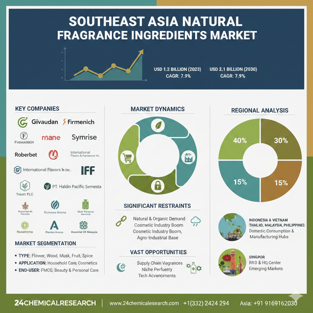 Southeast Asia Natural Fragrance Ingredients market was valued at USD 1.2 billion in 2023 and is projected to reach USD 2.1 billion by 2030, at a Compound Annual Growth Rate (CAGR) of 7.9% during the forecast period.