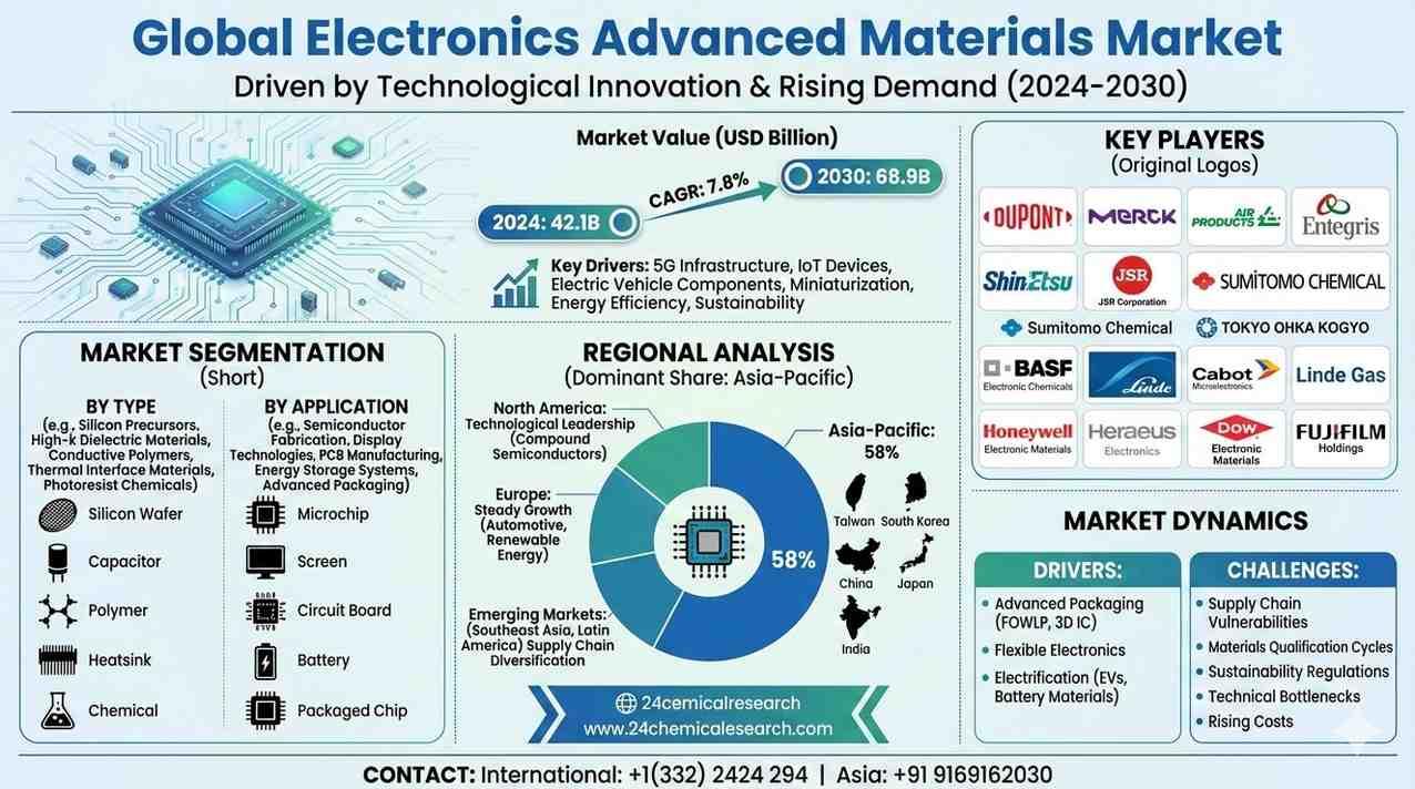 Global Electronics Advanced Materials Market is experiencing significant transformation, driven by technological innovation and rising demand across semiconductor, display, and energy storage applications. Valued at USD 42.1 billion in 2024, the market is projected to grow at a CAGR of 7.8%, reaching USD 68.9 billion by 2030. This expansion is fueled by advancements in 5G infrastructure, IoT devices, and electric vehicle components that require high-performance materials.