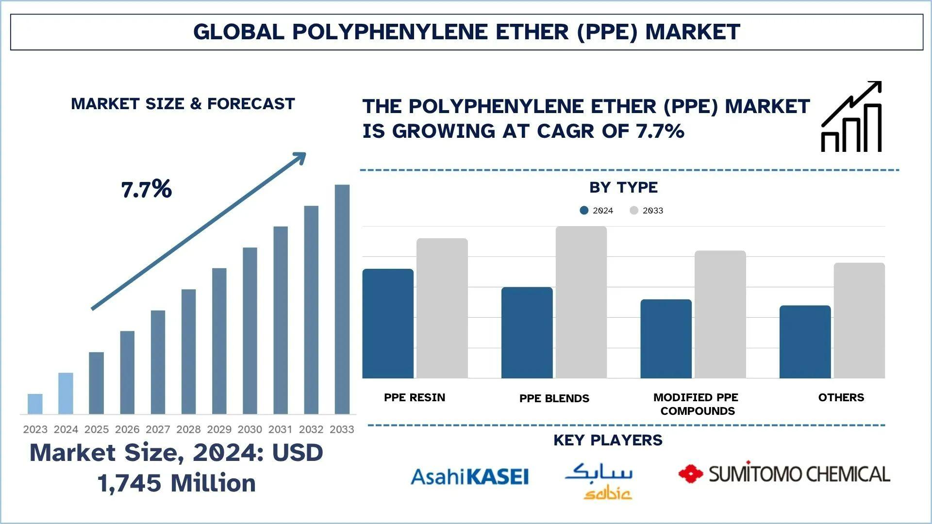 According to UnivDatos analysis, the rising adoption of high-performance engineering plastics in consumer and industrial applications is the major factor driving the growth of the Polyphenylene Ether (PPE) market. As per their “Polyphenylene Ether (PPE) Market” report, the global market was valued at USD 1,745 million in 2024, growing at a CAGR of about 7.7% during the forecast period from 2025 - 2033 to reach USD million by 2033.