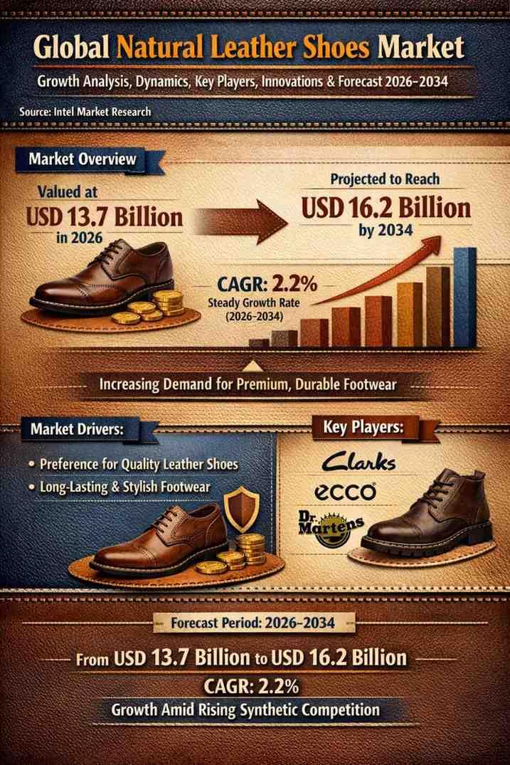According to a new report from Intel Market Research, Global natural leather shoes market was valued at USD 13.7 billion in 2026 and is projected to reach USD 16.2 billion by 2034, growing at a steady CAGR of 2.2% during the forecast period (2026-2034). This growth reflects enduring consumer demand for premium, durable footwear options despite increasing competition from synthetic alternatives.