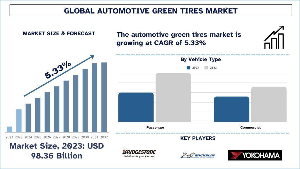 According to the UnivDatos analysis, The growth of the automotive green tires market is driven by several key factors: increasing environmental awareness among consumers and governments, leading to higher demand for eco-friendly products; stringent emission regulations and government incentives promoting the use of green technologies; technological advancements in tire materials and design, improving fuel efficiency and performance; and rising consumer preference for cost-effective solutions that offer long-term savings through improved fuel economy. These combined factors are propelling the adoption of green tires in the automotive industry, particularly in regions focused on sustainability. As per their “Automotive Green Tires Market” report, the global market was valued at USD ~98.36 billion in 2023, growing at a CAGR of about 5.33% during the forecast period from 2024 - 2032 to reach USD billion by 2032.