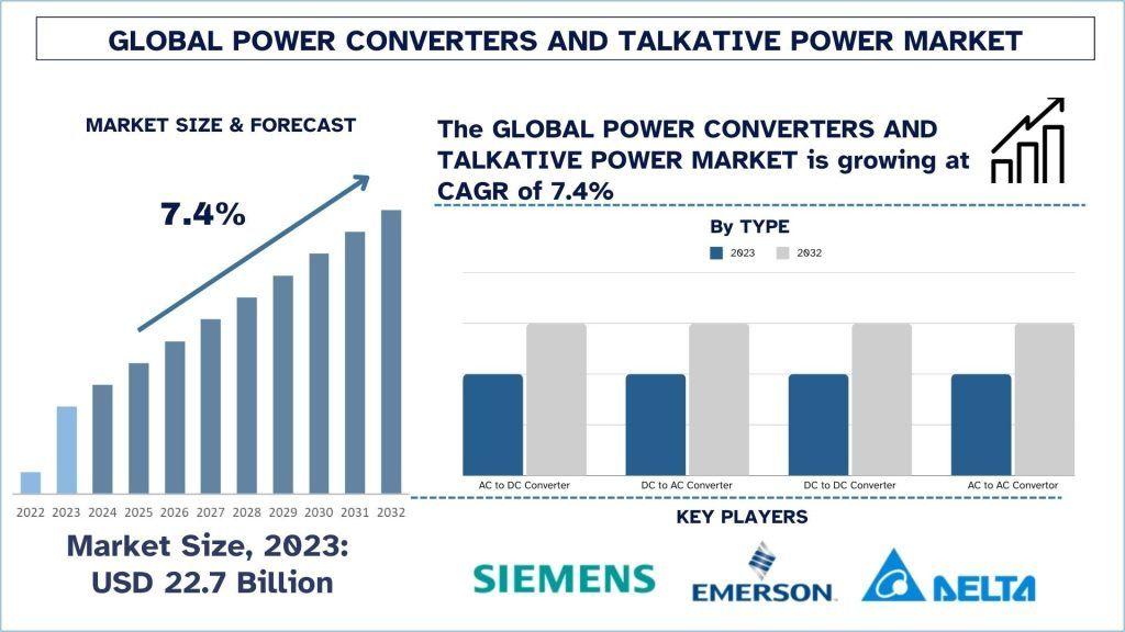 According to the UnivDatos analysis, the rising electric vehicles, renewable energy, and substantial government support would drive the global scenario of the Power Converters and Talkative Power market. As per their “Power Converters and Talkative Power Market” report, the global market was valued at USD 22.7 Billion in 2023, growing at a CAGR of 7.4% during the forecast period from 2024 - 2032 to reach USD Billion by 2032.