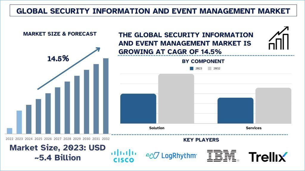 According to the UnivDatos analysis, the increasing cybersecurity threats, and shift towards cloud computing require SIEM solutions and integration with other security tools, the rise of managed security service providers (MSSPs) offering SIEM-as-a-Service market drives the security information and event management market. As per their “Security Information and Event Management Market” report, the global market was valued at USD 5.4 billion in 2023, growing at a CAGR of about 14.5% during the forecast period from 2024 - 2032 to reach USD billion by 2032.