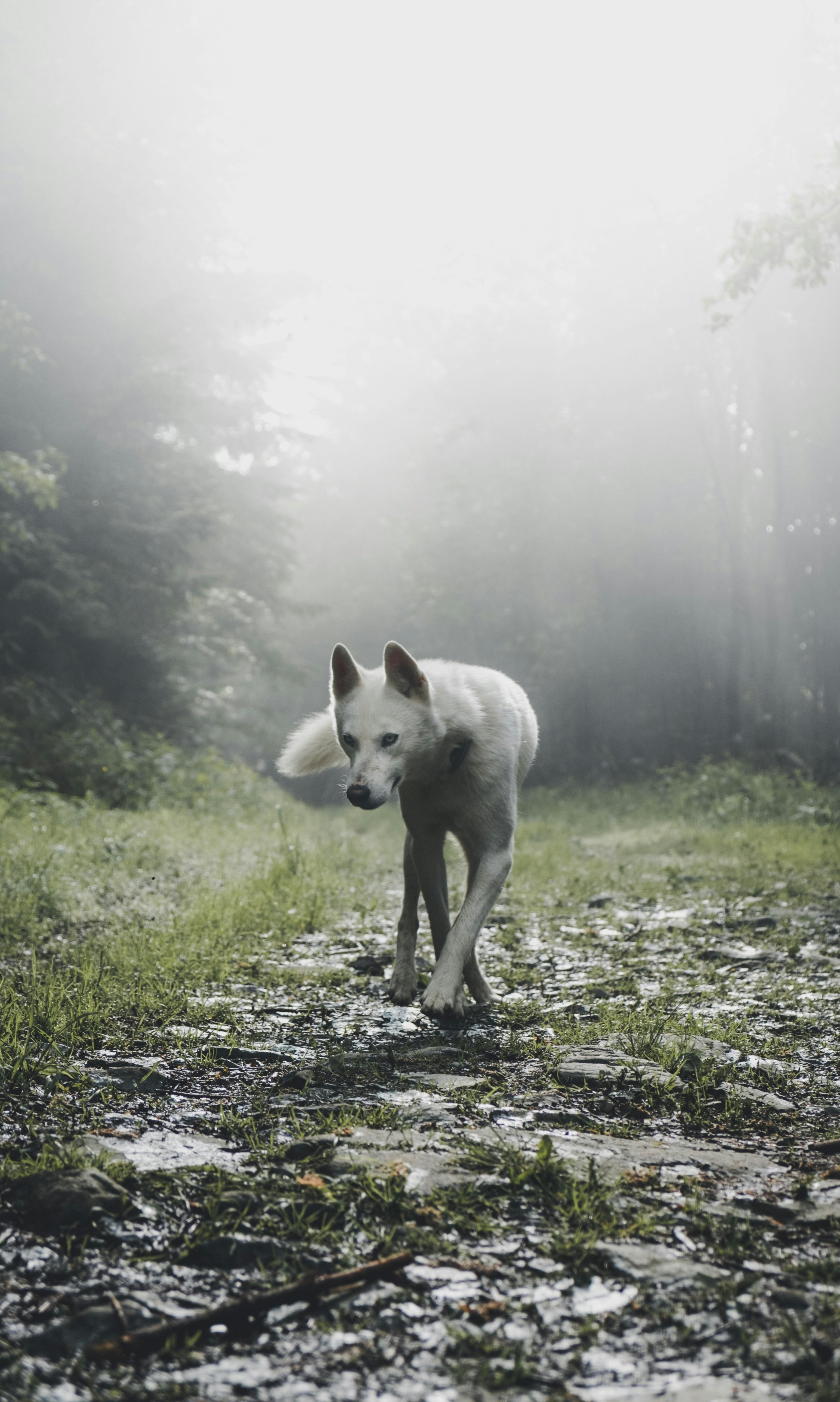 धुंध में घिरी एक सफेद कुत्ते की चाल