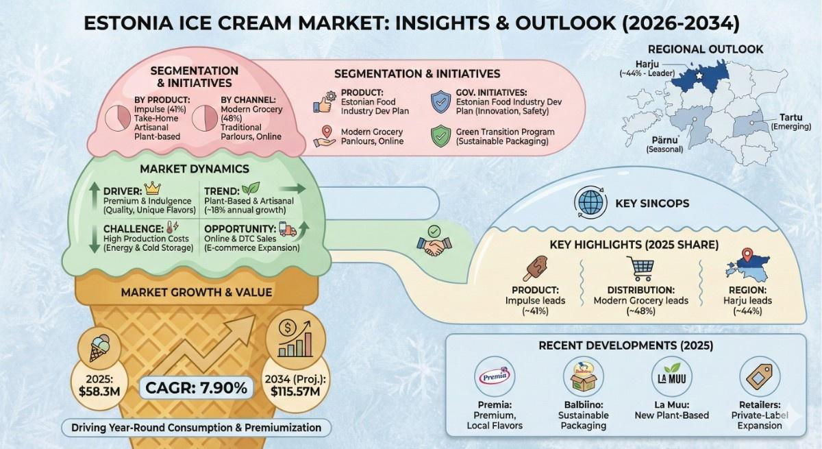 According to the latest report by The Report Cube, study Estonia Ice Cream Market is anticipated to register a CAGR of 7.90% during 2026-2034. The market size was valued at USD 58.3 million in 2025 and is projected to reach USD 115.57 million by 2034. This strong growth trajectory reflects changing consumer preferences toward indulgent desserts and premium frozen treats.