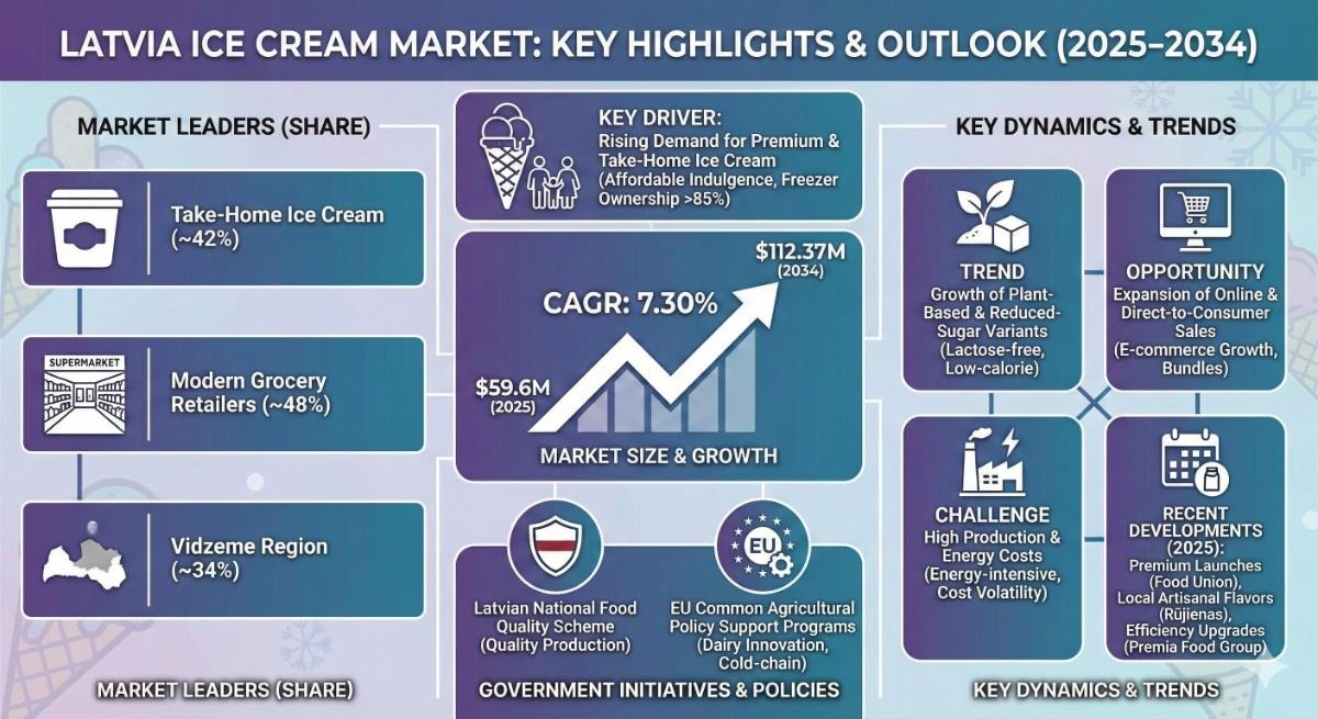 According to the latest report by The Report Cube, study Latvia Ice Cream Market is anticipated to register a CAGR of 7.30% during 2026-2034. The market size was valued at USD 59.6 million in 2025 and is projected to reach USD 112.37 million by 2034. This robust growth reflects changing consumer preferences, rising disposable income, and increasing demand for indulgent and premium frozen desserts.