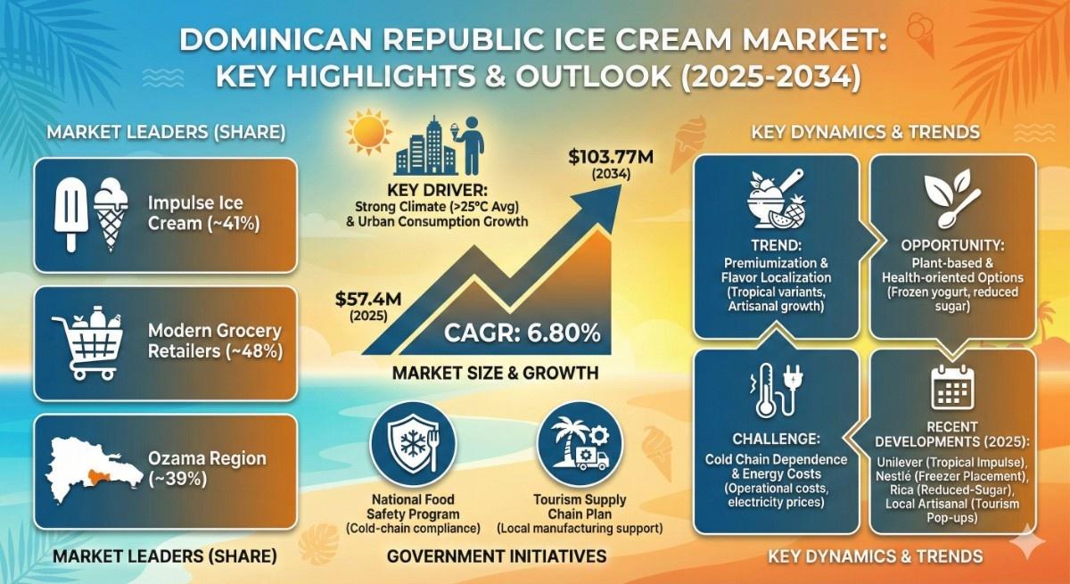 According to the latest report by The Report Cube, study Dominican Republic Ice Cream Market is anticipated to register a CAGR of 6.80% during 2026-2034. The market size was valued at USD 57.4 million in 2025 and is projected to reach USD 103.77 million by 2034. The market is transitioning from seasonal indulgence toward year-round consumption, supported by evolving consumer lifestyles and rising urban demand.