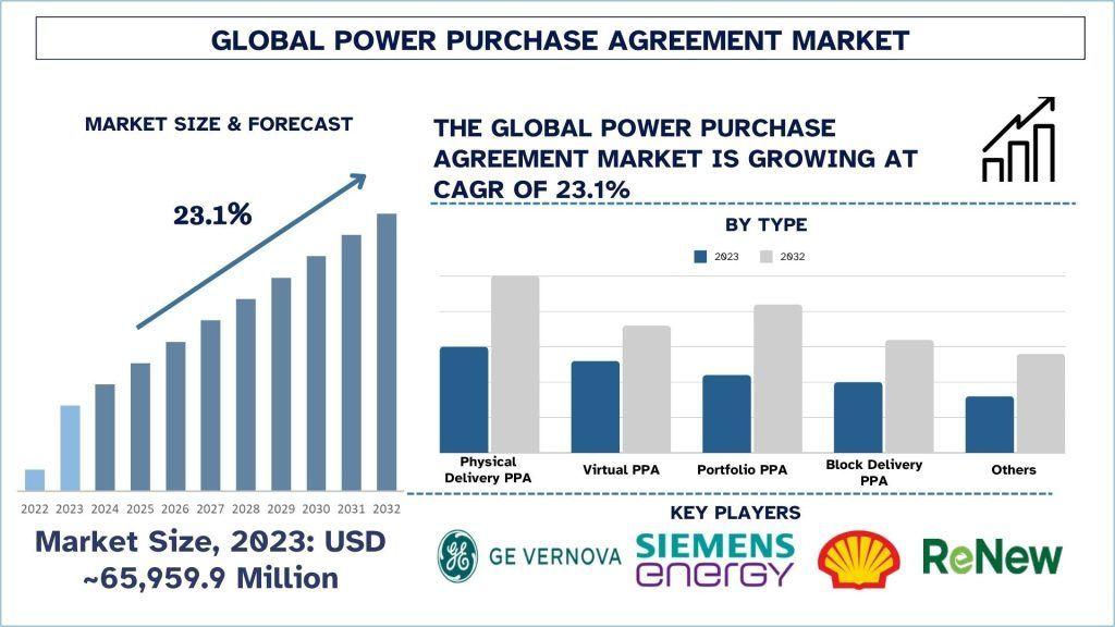 The Power Purchase Agreement Market was valued at USD 65,959.9 Million in 2023 and is expected to grow at a strong CAGR of around 23.1% during the forecast period (2024-2032).
