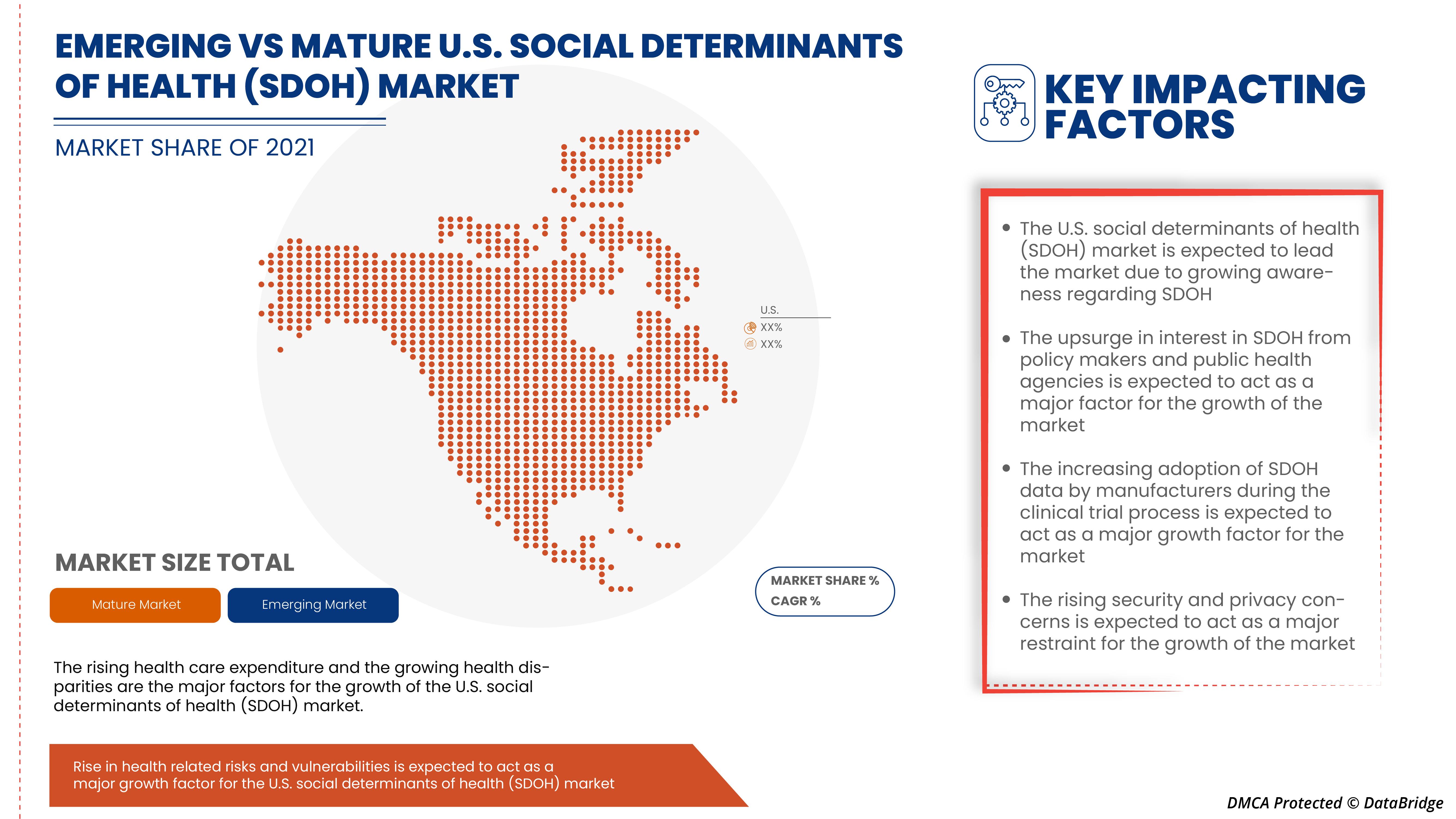 The key highlights of this U.S. Social Determinants of Health (SDOH) Market report are key market dynamics, the current market scenario, and future prospects of the sector. By understanding and keeping into focus customer requirement, one method or combination of many steps have been applied to build the most excellent market research report. Whereas market definition covered in this U.S. Social Determinants of Health (SDOH) report explores the market drivers, which indicate the factors causing a rise in the market growth, and the market restraints, which indicate the factors causing fall in the market growth. It helps customers or other market participants to be aware of the problems they may face while operating in this market over a longer period of time.