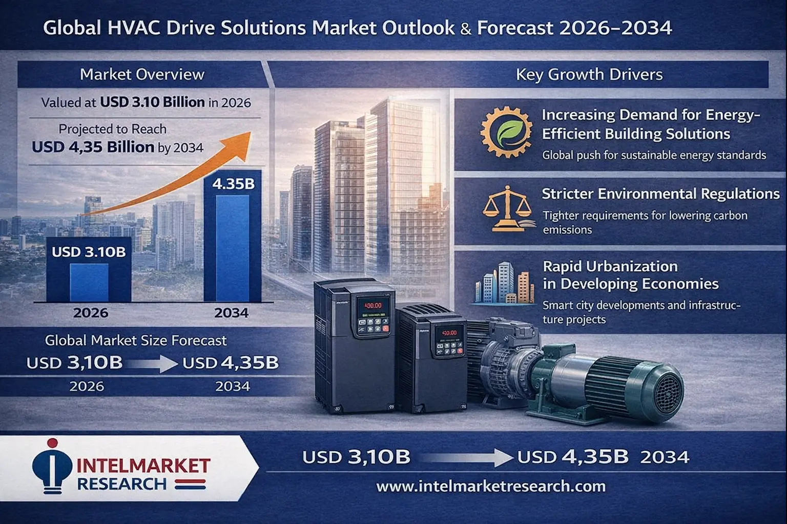 According to a new report from Intel Market Research, Global HVAC Drive Solutions market was valued at USD 3.10 billion in 2026 and is projected to reach USD 4.35 billion by 2034, growing at a CAGR of 5.1% during the forecast period (2026-2034). This growth is driven by increasing demand for energy-efficient building solutions, stricter environmental regulations, and rapid urbanization across developing economies.