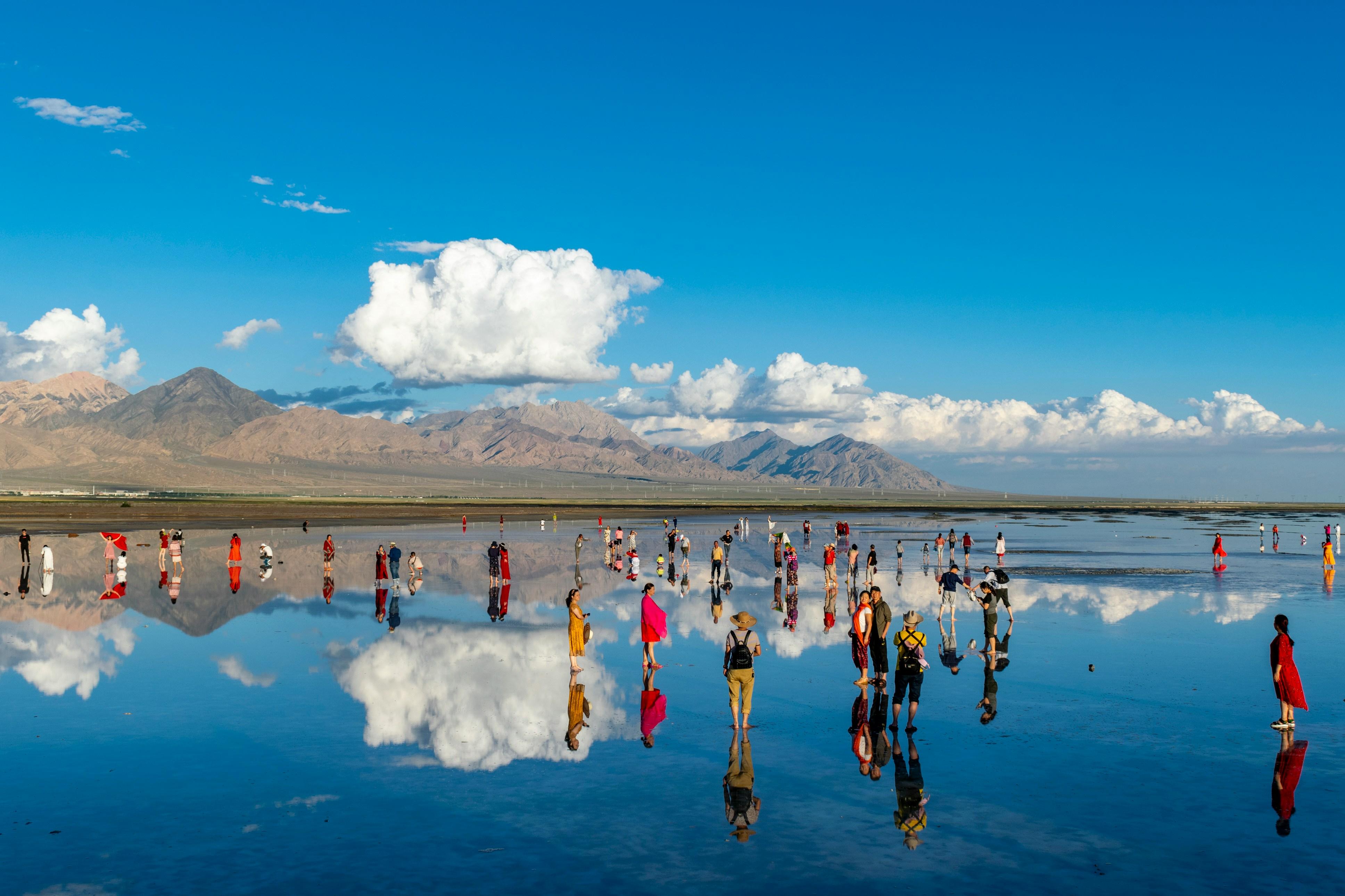 प्राकृतिक सौंदर्य और मानव गतिविधियों का यह मिश्रण एक अद्भुत दृश्य प्रस्तुत करता है। प्रतीत होता है कि आम लोग, जो आमतौर पर शहरी जीवन के शोरगुल में व्यस्त रहते हैं, अब इस शांत जल के परे अचंभित नजर आते हैं। यह दृश्य एक नमकीन तालाब के किनारे का है जहां लोग अपने प्रतिमानों में रंग-बिरंगे कपड़े पहने खड़े हैं, स्वाभाविक रूप से एक-दूसरे से बातचीत कर रहे हैं। यहां की खामोशी और जल का विशद आदान-प्रदान न केवल उनकी भौतिक उपस्थिति को प्रतिबिंबित करता है, बल्कि उनके विचारों और भावनाओं के भी अक्स प्रस्तुत करता है।