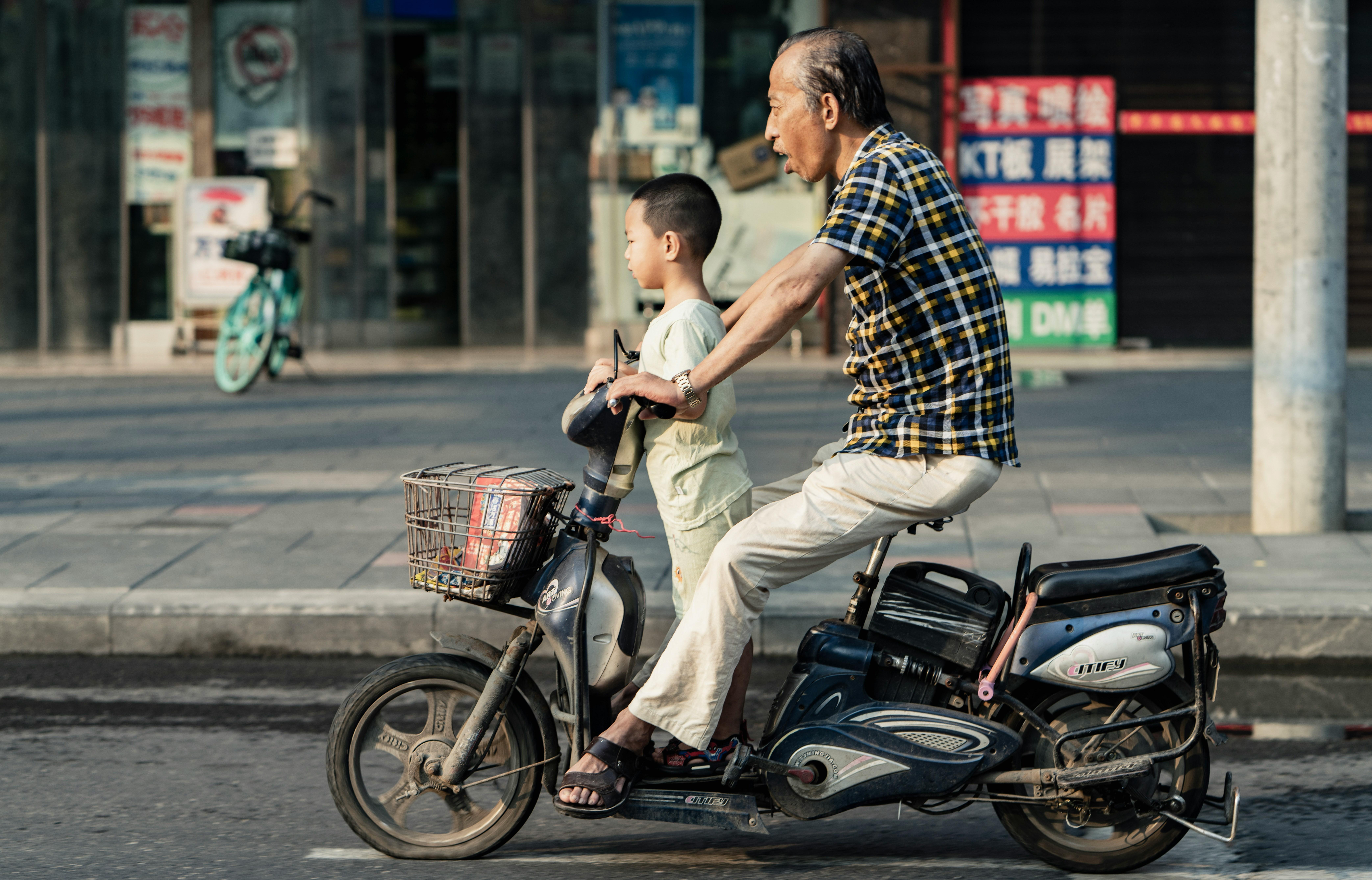 Two figures glide through the urban landscape, a testament to generational connection and shared experience. An older man, arm extended, steers an electric bike with effortless familiarity while a young boy, perched behind, gazes ahead, eyes filled with bo