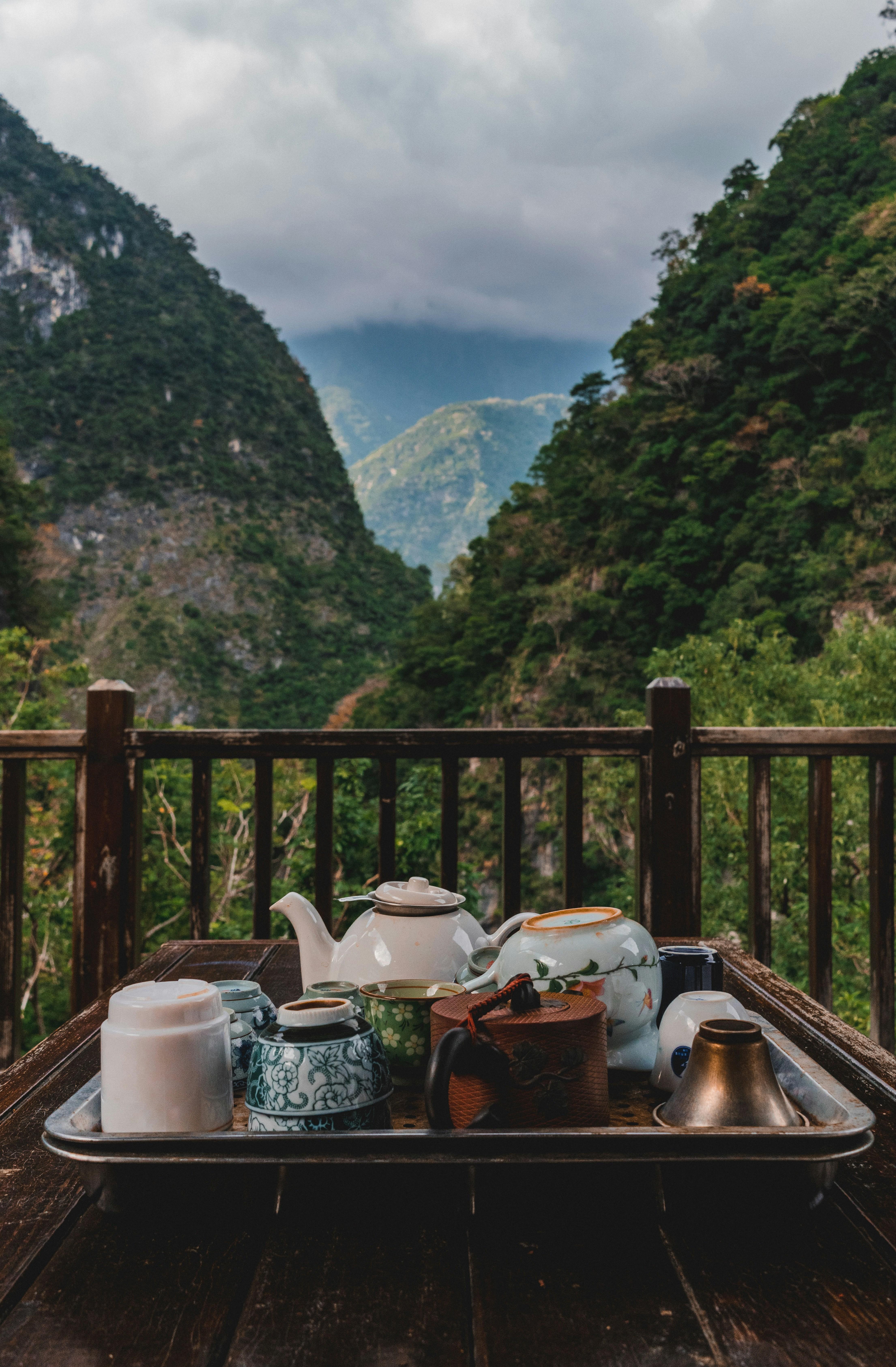 In the quiet embrace of nature, a tea set rests upon a wooden table, poised at the edge of a breathtaking vista that dips into valleys carpeted with lush green foliage. This serene scene invites contemplation, not just of the scenery but of the age-old rit