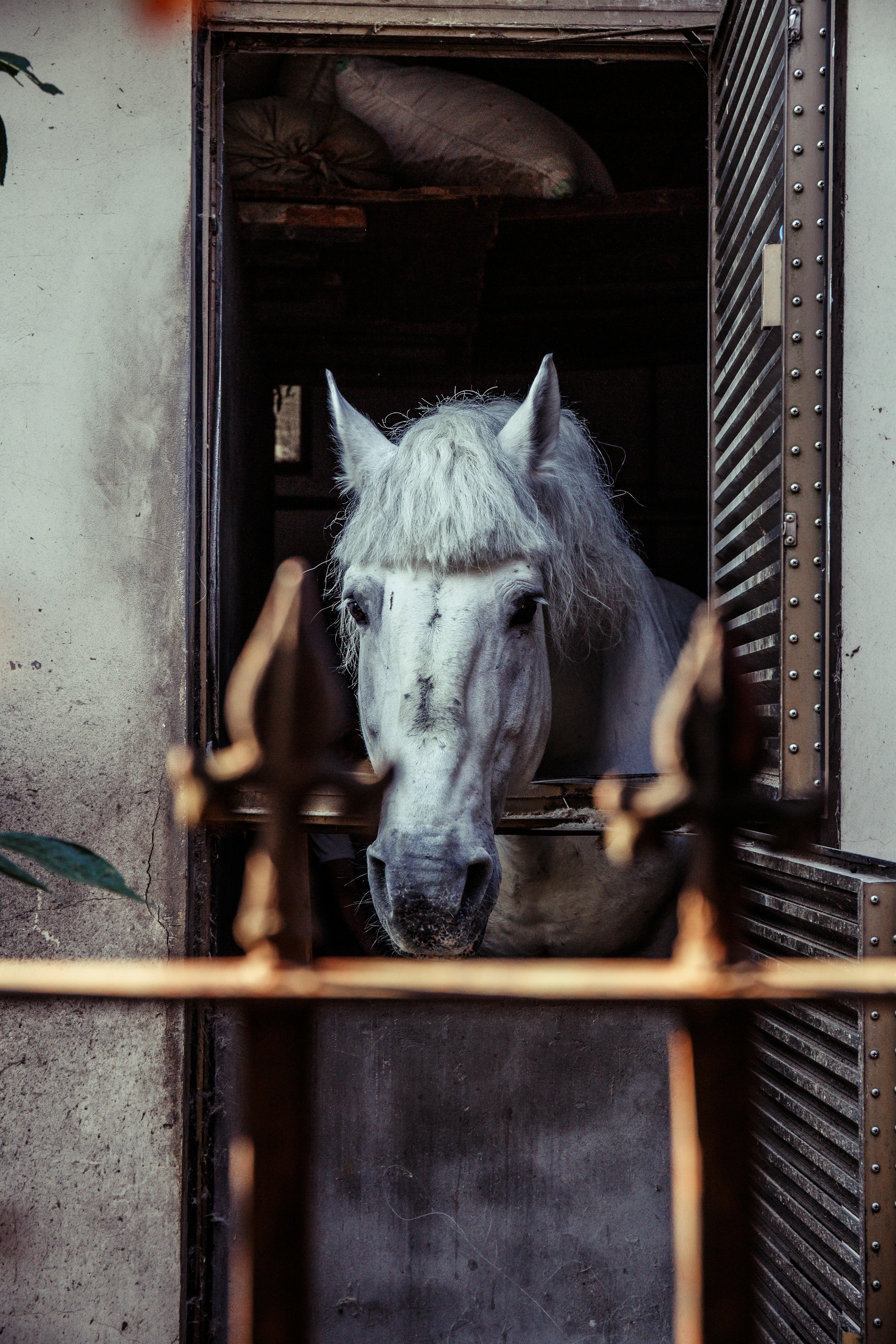घोड़े, जिनकी सुंदरता और शक्ति ने सदियों से मानवता को मोहित किया है, वह न केवल भौतिक रूप से आकर्षक होते हैं, बल्कि उनकी सामाजिक संरचना और व्यवहार भी अत्यंत रोचक हैं। जब एक सफेद घोड़ा, जैसे कि हम इस छवि में देख रहे हैं, दरवाजे के पार से झांकता है, वह हमें न केवल अपनी बाहरी सुंदरता दिखाता है, बल्कि अपने जटिल मनोदशा की भी झलक देता है।