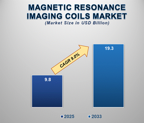 The Magnetic Resonance Imaging Coils Market is anticipated to experience substantial growth from 2025 to 2033, increasing prevalence of chronic diseases, such as neurological & cardiovascular disorders, and cancer, is expected to drive the market. With an estimated valuation of approximately USD 9.8 billion in 2025, the market is expected to reach USD 19.3 billion by 2033, registering a robust compound annual growth rate (CAGR) of 9.0% over the decade.