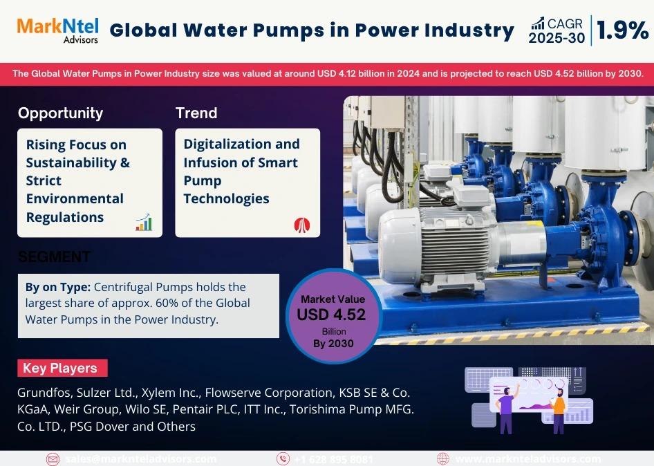 As per recent study by Markntel Advisors The Global Water Pumps in Power Industry size was valued at around USD 4.12 billion in 2024 and is projected to reach USD 4.52 billion by 2030. Along with this, the market is estimated to grow at a CAGR of around 1.9% during the forecast period, i.e., 2025-30.