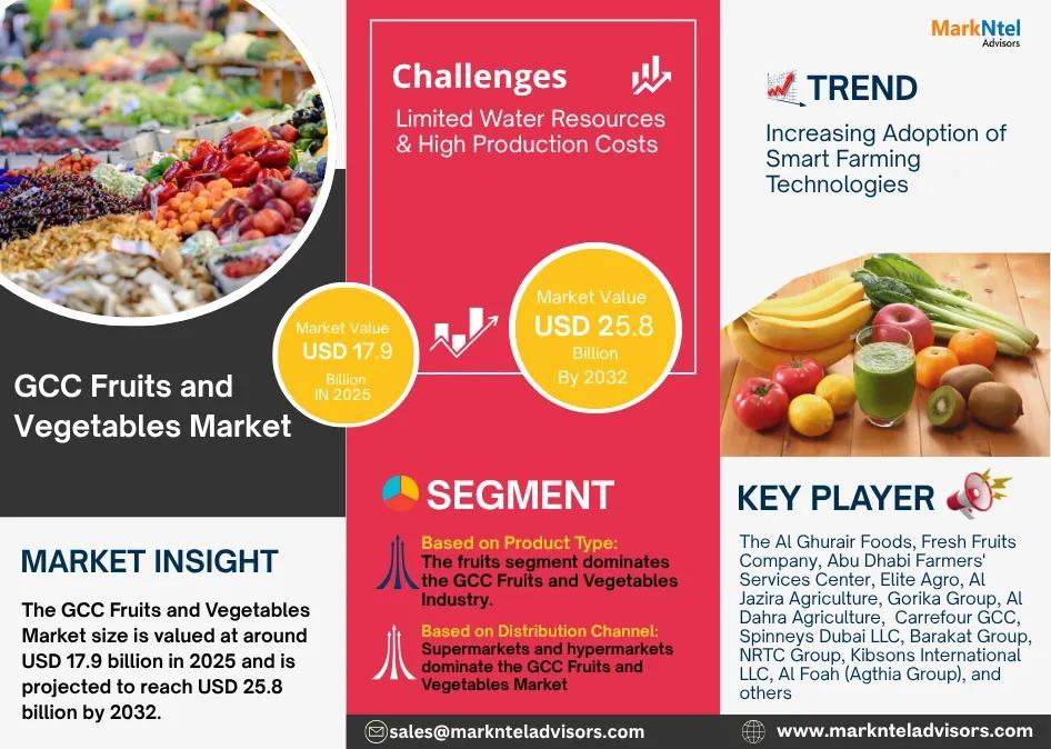 As per recent study by Markntel Advisors The GCC Fruits and Vegetables Market size is valued at around USD 17.9 billion in 2025 and is projected to reach USD 25.8 billion by 2032. Along with this, the market is estimated to grow at a CAGR of around 5.38% during the forecast period, i.e., 2026-32.