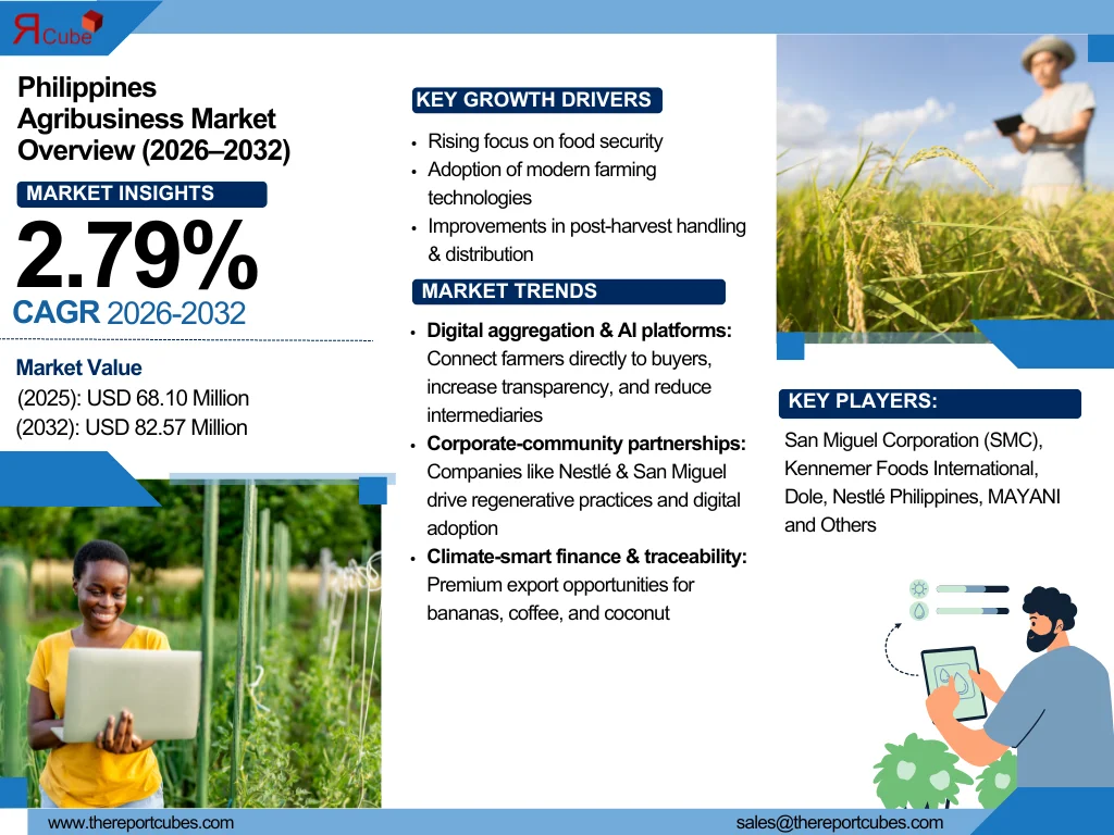 According to the latest report by The Reports Cube insights The Philippines Agribusiness Market is anticipated to register a CAGR of around 2.79% during the forecast period, 2026-32. Additionally, the market size was valued at nearly USD 68.10 million in 2025 and is projected to reach nearly USD 82.57 million by 2032.