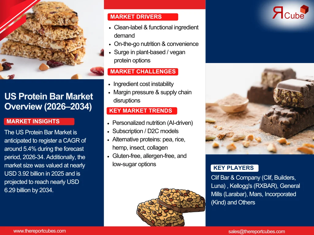 According to the latest report by The Reports Cube insights The US Protein Bar Market is anticipated to register a CAGR of around 5.4% during the forecast period, 2026-34. Additionally, the market size was valued at nearly USD 3.92 billion in 2025 and is projected to reach nearly USD 6.29 billion by 2034.