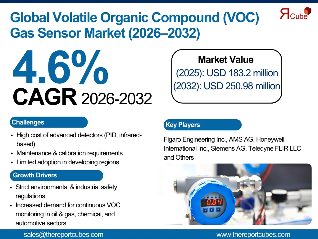 According to the latest report by The Reports Cube insights The Global Volatile Organic Compound Gas Sensor Market is projected to register a CAGR of around 4.6% during 2026–32, with its size valued at USD 183.2 million in 2025 and expected to reach USD 250.98 million by 2032..
