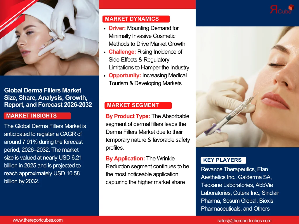 According to the latest report by The Report Cube, study Derma Fillers Market is anticipated to register a CAGR of around 7.91% during the forecast period, 2026–2032. The market size is valued at nearly USD 6.21 billion in 2025 and is projected to reach approximately USD 10.58 billion by 2032. The expansion of the market is greatly attributed to the surging demand for non-invasive aesthetic processes, the increasing geriatric population looking for anti-aging solutions, and the mounting influence of social media-driven beauty trends. Also, technical advancements in filler compositions, specifically hyaluronic acid-based dermal fillers, have improved safety profiles & longevity, resulting in greater customer satisfaction.