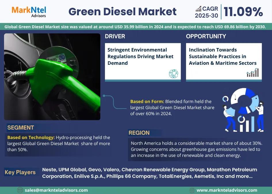 According to MarkNtel Advisors study The future of Global Green Diesel Market size was valued at around USD 35.99 billion in 2024 and is expected to reach USD 69.86 billion by 2030. Along with this, the market is estimated to grow at a CAGR of around 11.09% during the forecast period, i.e., 2025-30.
