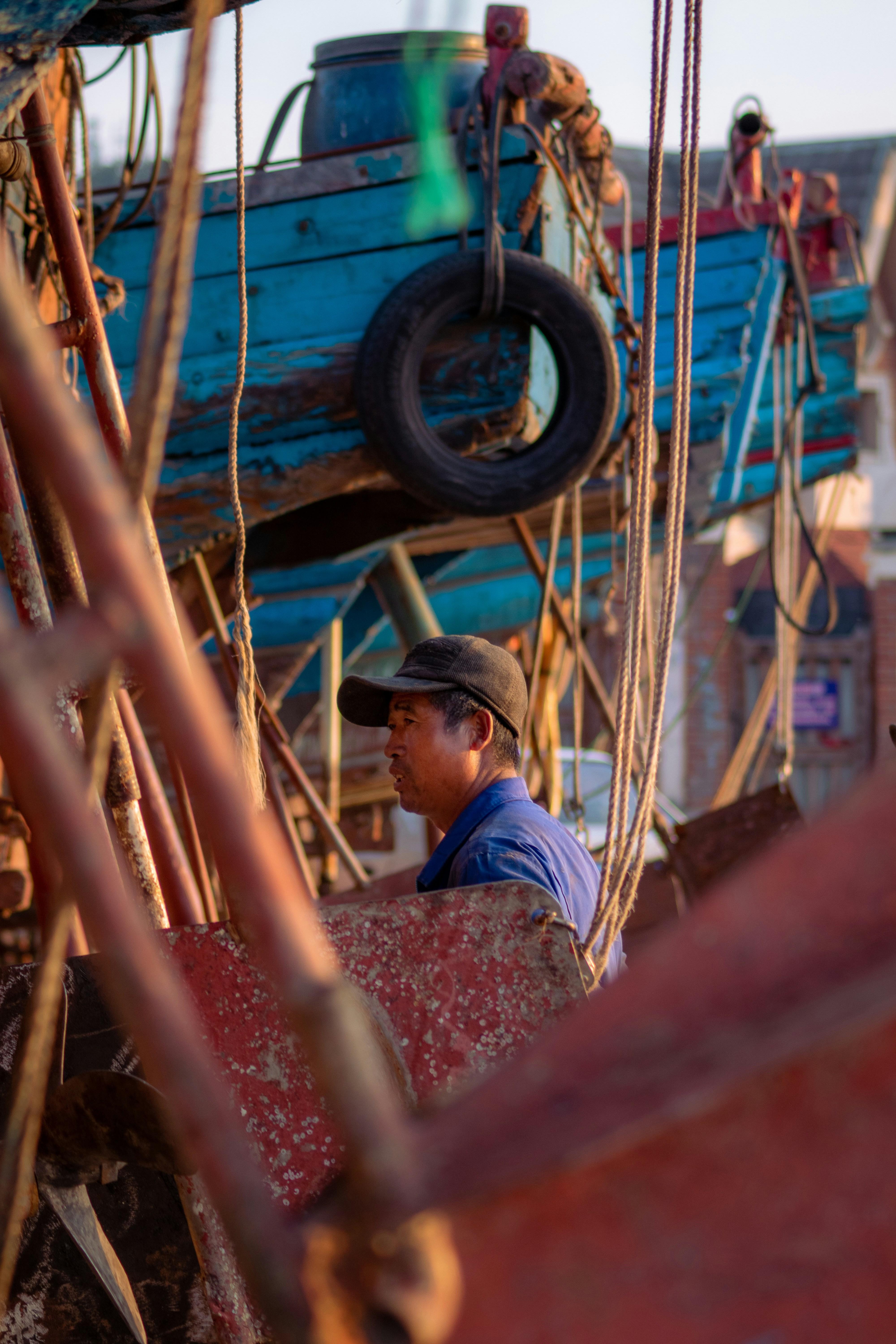 एक मस्त नाव के बीच ये आदमी, जो शायद समुद्र का कुछ जादू समझता है। लेकिन क्या उसे पता है कि उसके स्टाइल में थोड़ी कमी रह गई है? नाव के रंग से ज्यादा कूलियत तो उसका कैप है!