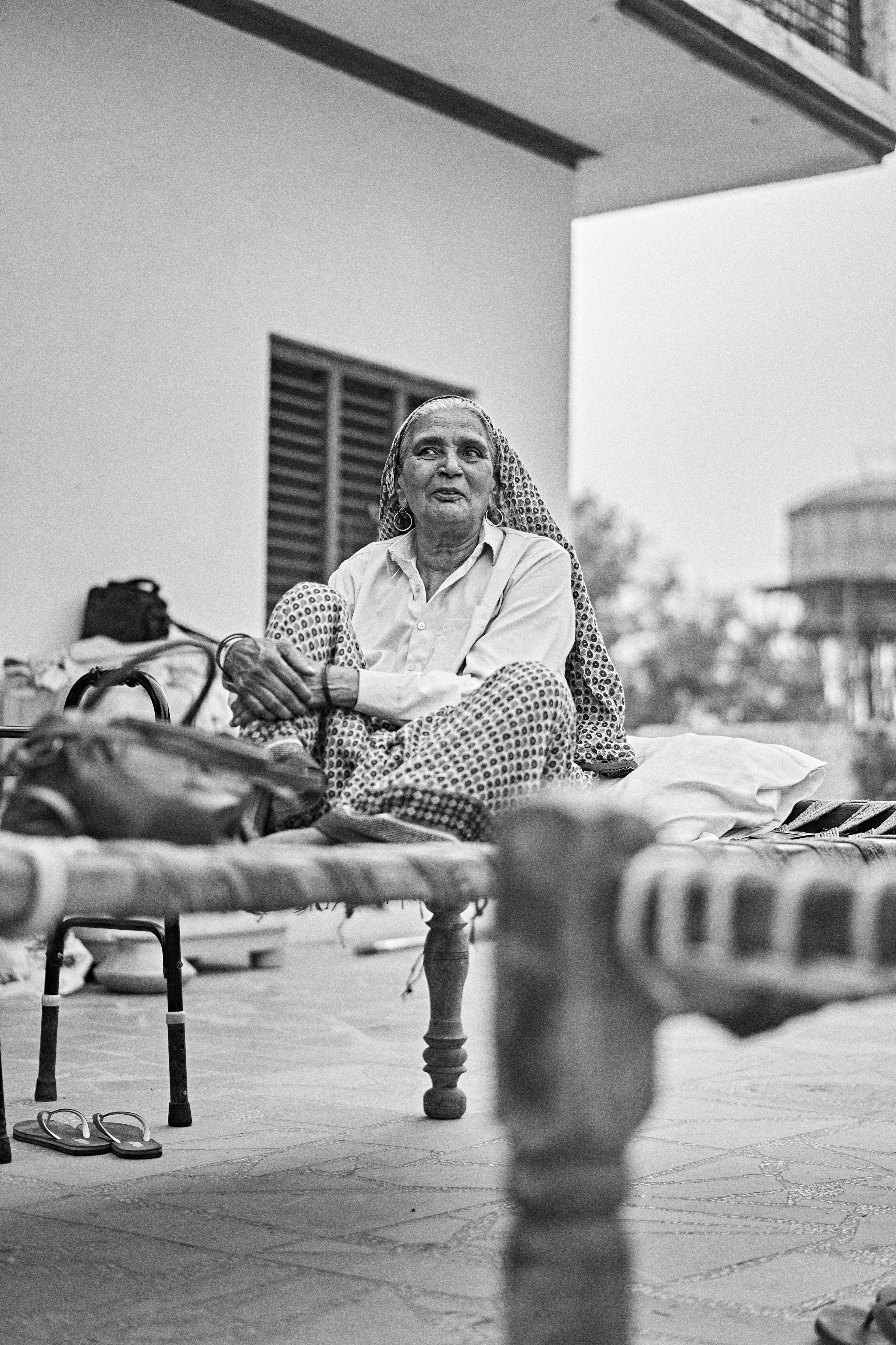 امرأة مسنّة تجلس بلثة في فناء منزلها. يبدو أن أسلوبها في الموضة يصرخ "أنا مرتاحة، وليس لدي أي خطط". يا له من قرار جريء! #سيدة_عجوز #موضة_فريدة #راحة