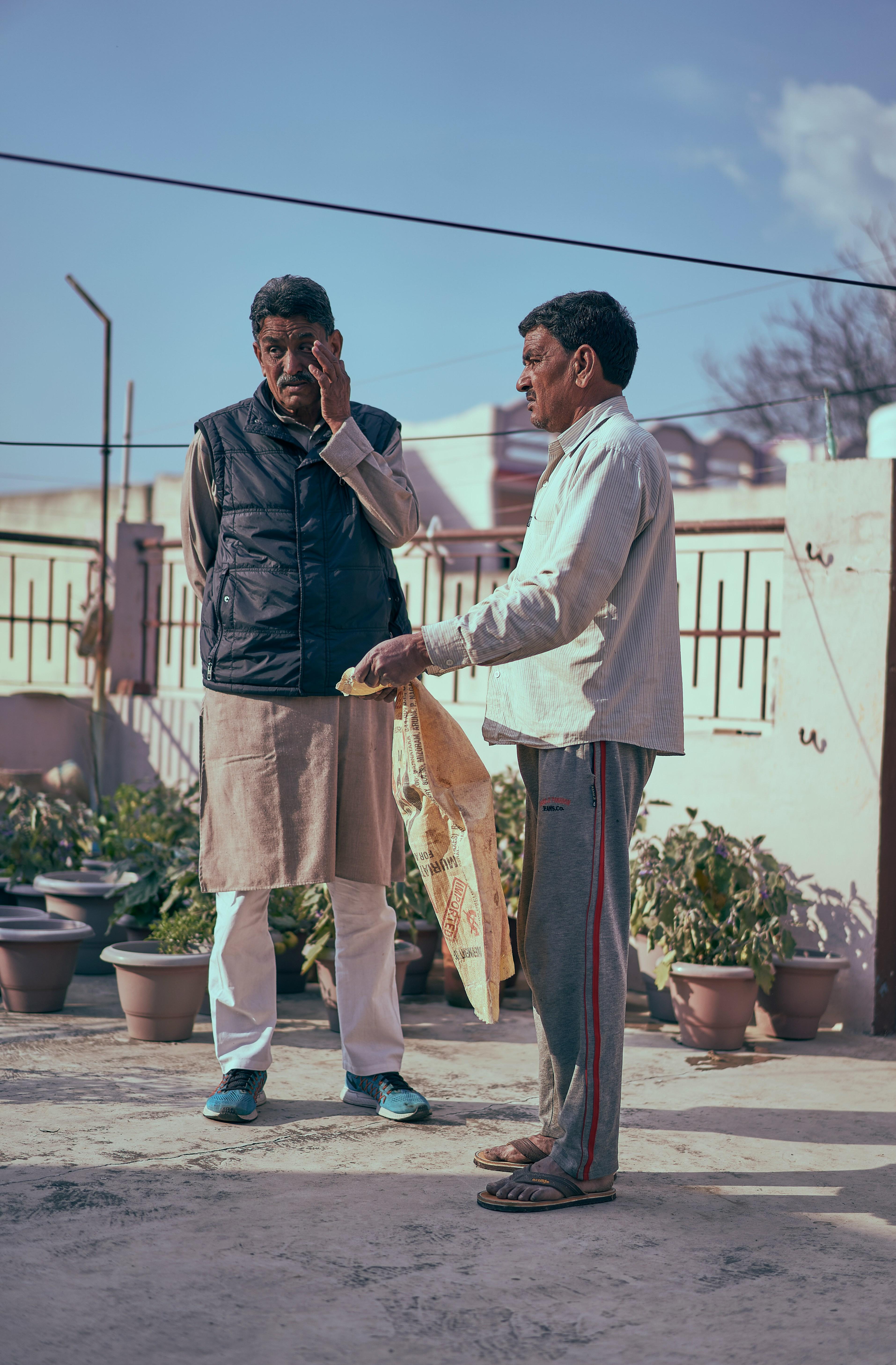 Deux hommes discutent sur une terrasse, l'un portant un gilet et l'autre en survêtement. Ah, la mode d’aujourd’hui, c’est vraiment un mystère, mais au moins, les chaussures dépareillées sont un choix audacieux ! #StyleUnique #CasualChic #GiletIncontournable